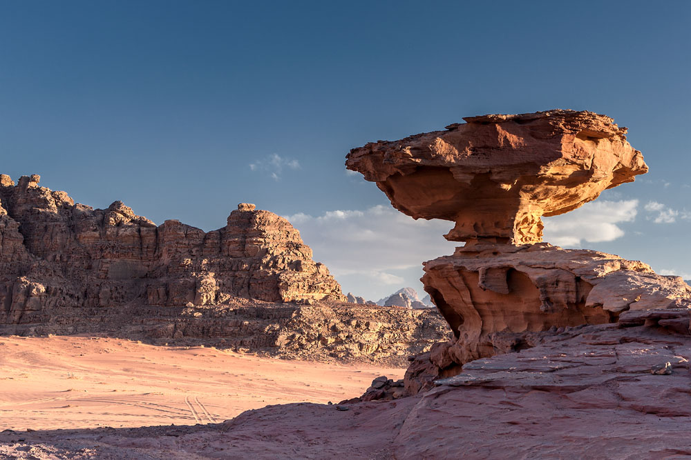 Am frühen Nachmittag kommen wir in Wadi Rum an und machen Quartier im Captains Camp. Für den späten Nachmittag haben wir einen Jeep und einen „geländetauglichen“ Fahrer bestellt, denn im tiefen, warmen Sand kommt man nur so vorwärts. Touristen sind hier kaum unterwegs, ruhig und wie am ersten Tag der Schöpfung liegen die Wüste und die daraus hervorragenden Inselberge vor uns. Es ist ein unvergesslicher Eindruck. Was macht es da, das unser „geländegängiger“ Fahrer die berühmten „Sieben Säulen der Weisheit“ gar nicht zu kennen scheint und uns zum Sonnenuntergang zu einem ganz anderen Punkt fährt.