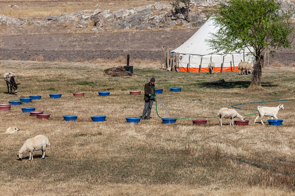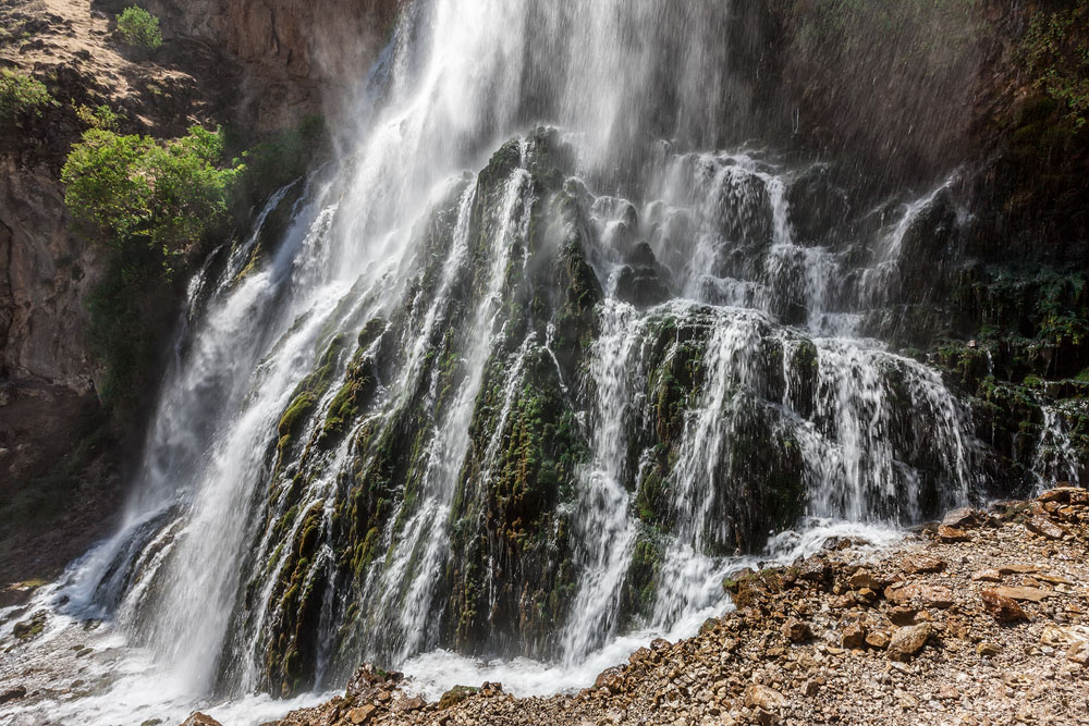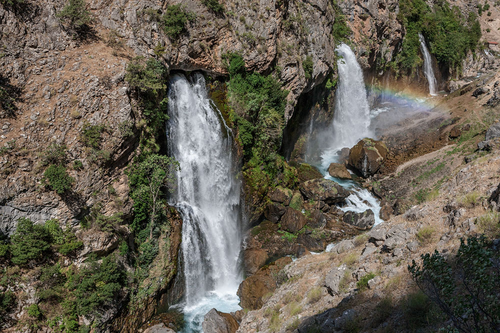 Wie war das noch in Kavafis Gedicht ? „Brichst du auf gen Ithaka, wünsch dir eine lange Fahrt, voller Abenteuer und Erkenntnisse…“ Die Wasserfälle von Kapuzbaşi in der Nähe von Yahyali liegen gut 3 Stunden von Uchisar entfernt. Die Fahrt geht vorbei am Hasan Dagi, dessen Silhouette Kegel aus dem frühmorgendlichen Dunst hinter vorgelagerten Hügelketten herausragt. Wir durchqueren, staubige Ebenen, auf denen Wanderarbeiter aus Ostanatolien zur Schafschur ihre Zelte aufgeschlagen haben und erreichen auf alpinen Serpentinenstraßen und durch wildromantische Schluchten schließlich die Wasserfälle. Es ist kein kleines Rinnsal, das hier aus dem Berg tritt. Aus mehreren Einschnitten sprudeln tosende Wassermassen hervor. Die Gischt ist so stark, dass sich kleine Regenbogen über der Schlucht bilden. Hierher treibt es keine ausländischen Touristen her; es ist ein Ausflugsziel für türkische Tagesausflügler. Ganze Familien suchen sich ein ruhiges Plätzchen. Man schwärmt aus, sammelt Holz, zündet am Flussufer ein kleines Grillfeuer an, und schon bald liegen leckere Lammspieße auf dem Rost und verströmen einen unwiderstehlichen Duft. Wir teilen unser Picknick, und unserer Einladung folgt sofort auch die Gegeneinladung. So gesättigt kann man im Schatten ein kleines Nickerchen machen….., bis drei junge Grazien die Ruhe stören. Die jungen Ladies scheinen ein wenig „Türkiye’s next Top Model“ zu spielen und fotografieren sich gegenseitig mit dem Mobiltelefon. Und ewig lockt das Weib! Ich kann es nicht mit ansehen. Die Girls stehen immer im Schatten, das Kopftuch zudem noch tief im Gesicht. Ich gebe ein wenig Fotounterricht und ganz schnell haben sie das Posen für die Kamera drauf. Nicht so routiniert wie Heidi Klum, aber mit natürlicher Anmut.