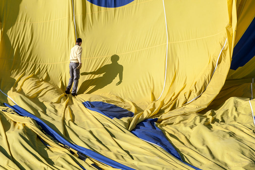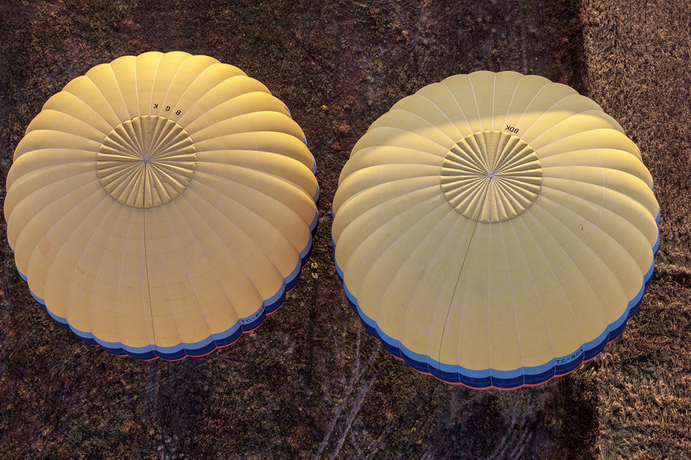 „Unser Montgolfier“ an diesem Morgen ist Graham. Wir kennen uns aus dem vergangenen Jahr. Graham ist ein wahrer Virtuose an den Steuerleinen und Experte in der Ausnutzung kaum wahrnehmbarer Luftströmungen. Wir starten an diesem Morgen in der Nähe von Zelve. Mehr als 40 Ballons zähle ich. Der Ballon überquert die „Zipfelmützen von Paşa Baği“ und schwebt über Çavuşin in Richtung Uçhisar. Ich frage Graham ob es eine Chance gibt, dass wir hinüber ins Aşk Vadisi kommen. Er antwortet: „Let’s see what we can do“. Zunächst sieht es nicht so aus als ob das gelänge. Die Ballonflotte hält mit dem Wind Kurs auf Uçhisar . Graham zupft und zieht an den Seilen und Leinen, dreht den Ballon etwas, und wie von Zauberhand lösen wir uns von der Masse. Schnell tauchen die „Spargelspitzen“ der Felsnadeln unter uns auf und Graham lässt den Ballon etwas sinken. Der Schattenwurf des Ballons zeichnet sich scharf auf den strahlend weißen Felsen ab. Well; – räuspert sich Graham: „Here we are – Ladies and Gentlemen >Viagra-Valley<“ In der Tat könnte man bei den Felsen an übergroß geratene Phalli denken. Wahrscheinlich hat das Tal auch daher seinen Spitznamen „Love-Valley“. Im vergangenen Jahr hatte ich das große Glück, am frühen Morgen im Talgrund zu stehen, während die ganze Ballon-Armada wie an den Fäden eines Marionettenspielers in das Tal hinab sank und wieder aufstieg. Heute sind wir mit unserem Ballon die einzigen dort. Der Ballon steigt wieder und bald schon erkenne ich unter uns das Pigeon Valley. Am Ortsrand von Uçhisar taucht unter uns das Hauptquartier von Anatolian Balloons auf. Die haben einen schönen Garten, einen netten Schrottplatz und einen brandneuen Tower. Da steigt der Chef immer hinauf um sein Geld zu zählen; meint Graham mit typisch britischem Humor. Kurz darauf kommt sein Kommando: „Well folks, – Landing position, please“ und sanft wie eine Feder setzt der Korb auf dem Boden auf. Nach zwei kurzen Lupfern steht der Korb samt Ballon auf dem Trailer, die Kappe wird geöffnet und die Ballonhülle fällt in sich zusammen. Es ist eben nichts als heiße Luft ! Der sicheren Landung folgt die unvermeidliche Champagner-Zeremonie. Graham meint „they call it champagne“; von dem süssen Kuchen, der dazu kredenzt wird, hält er auch nicht viel. Den verfüttere er sonst an die Tauben. Als die Crew dann den Korb mit Blümchen drapiert, knurrt er noch, das die sicher aus dem Garten von Anatolia Ballons stammen und fügt noch schnell hinzu: „please ask me a question; otherwise I have to work“ . Die Crew hat damit begonnen, die Ballonhülle zusammenzulegen und zu verpacken und Graham’s Unterhaltungsprogramm für die Gäste ist da schon leichter. Wir lachen Tränen, womit wir wieder bei den Tränen des Himmels wären. Ganz sicher werden wir uns wiedersehen, irgendwo am Himmel über Kappadokien; – schon im nächsten Jahr.