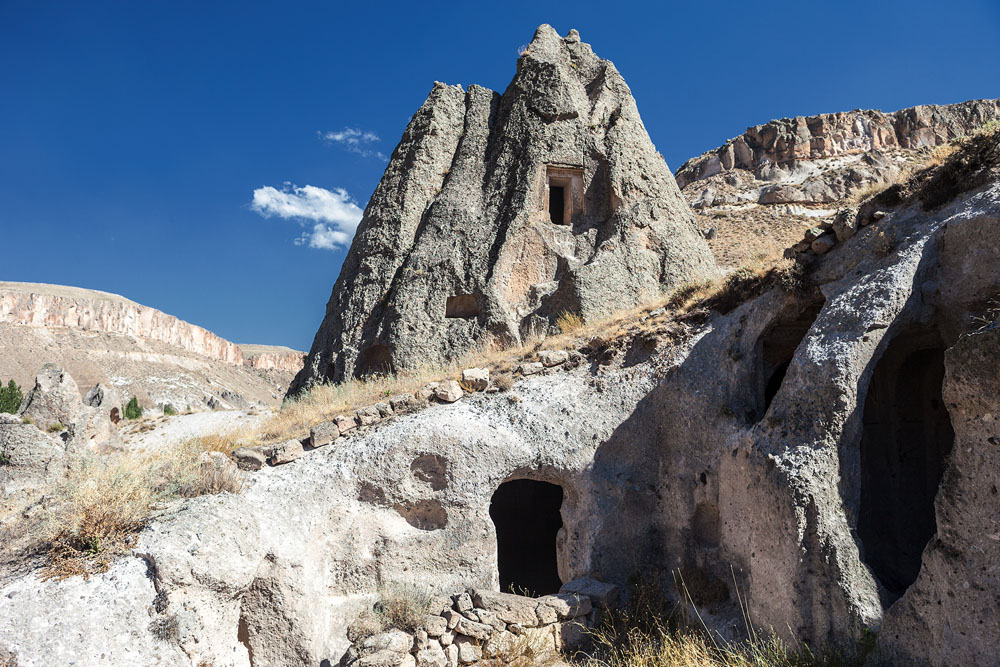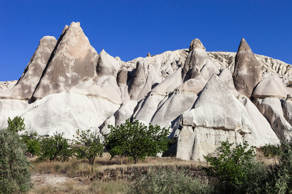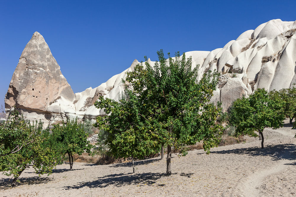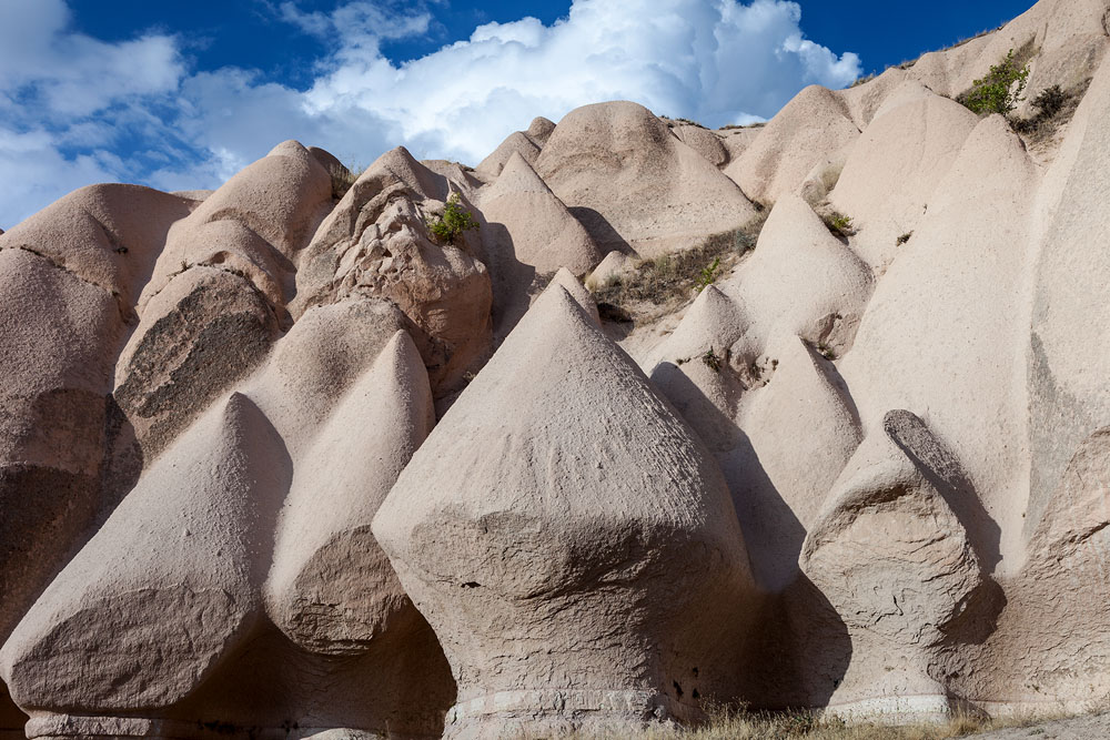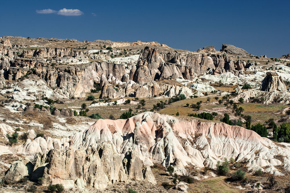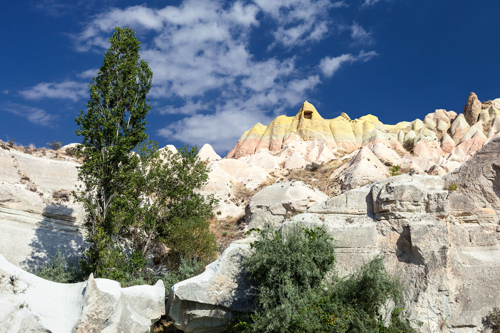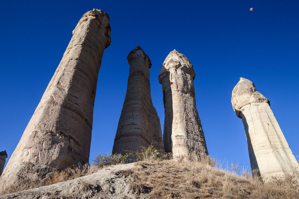 „On the Rocks“ geht es auch weiter, in die Täler Kappadokiens. Felsnadeln und Feenkamine wohin man schaut. Im Pigeon-Valley zwischen Uçhisar und Göreme, im Devrent-, und Kizil Cukur-Valley, an den Zipfelmützentürmen in Paşabaği oder den Tuffstein-Formationen von Güllüdere, die man auch Rose-Valley nennt. Man kann sich nicht satt sehen an Formen, Farben und Strukturen, zwischen breiten Taleinschnitten und engen Schluchten. Erdgeschichtliches wechselt sich ab mit Zeugnissen früher Besiedelung. In schroffen Fels haben Menschen ihre Kirchen, Wohnungen und Stallungen gehauen; zum Schutz vor Feinden nutzten sie die natürlichen Gegebenheiten.