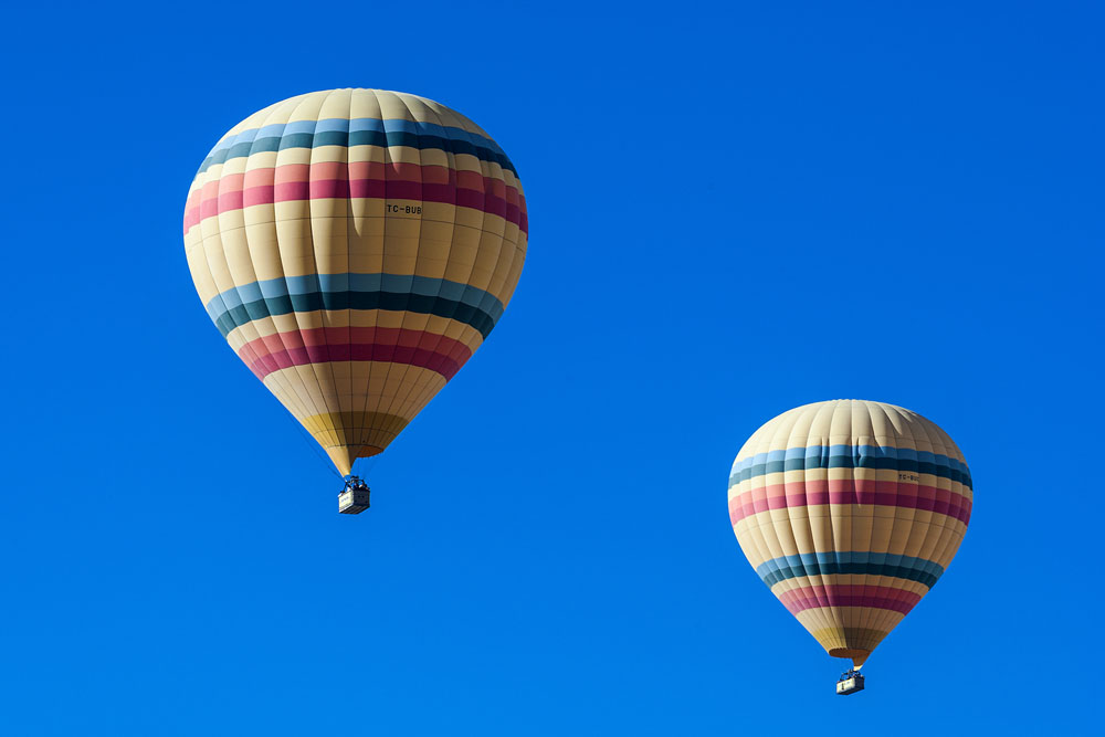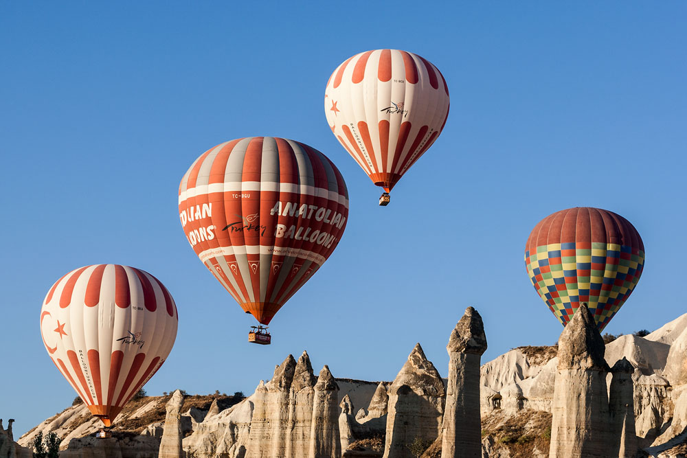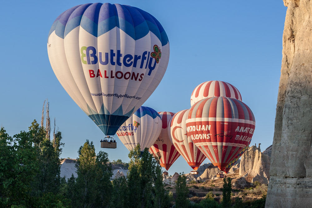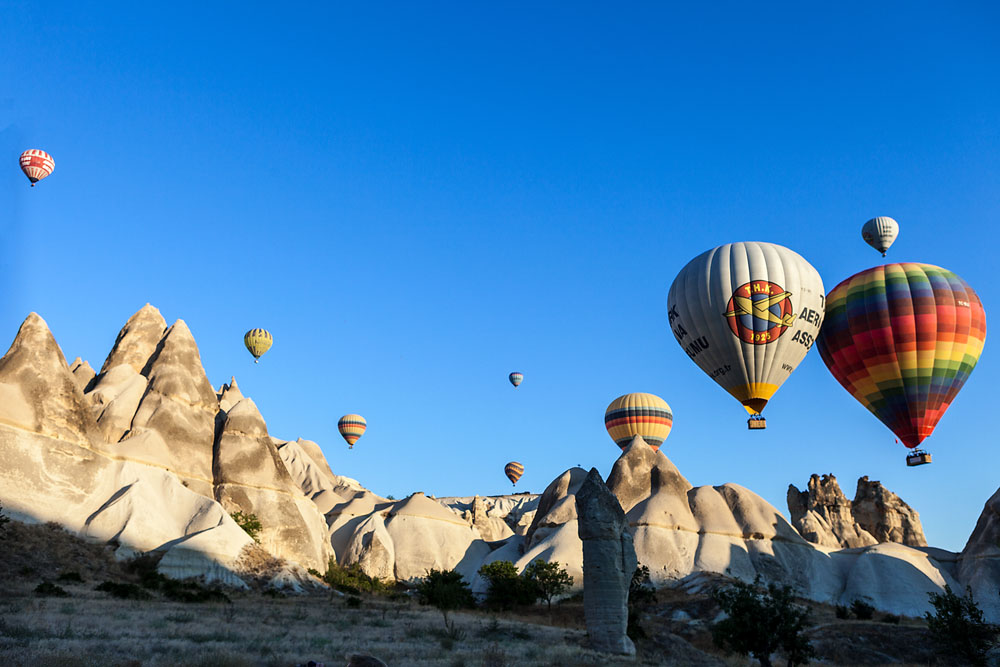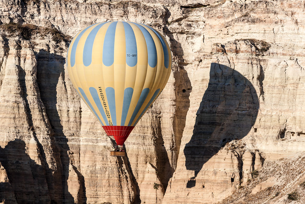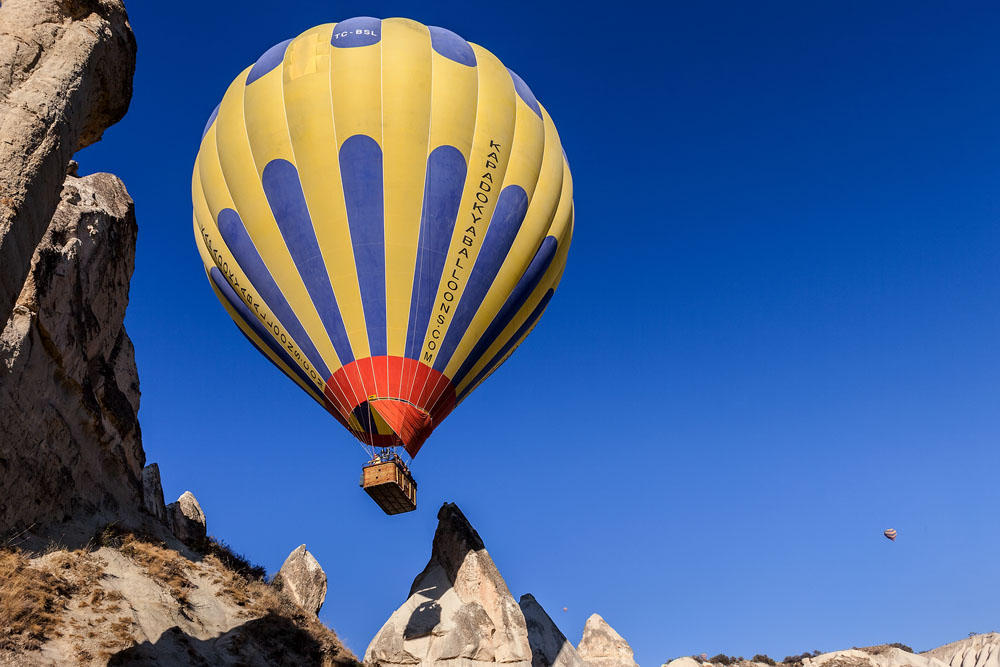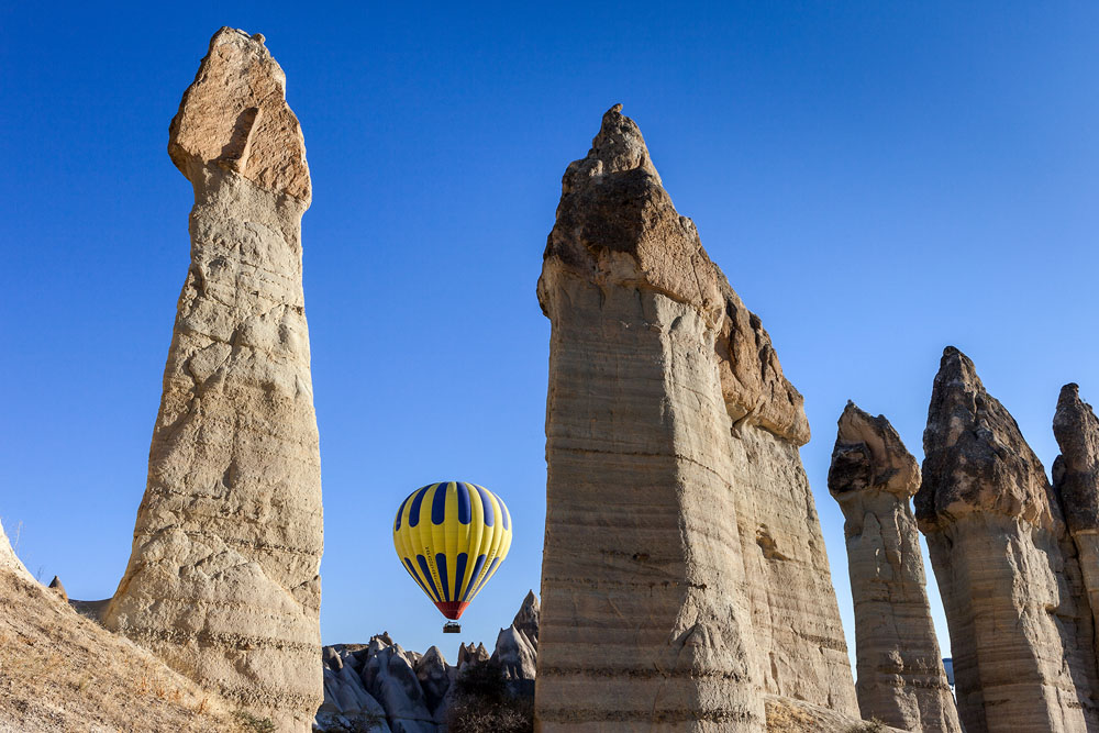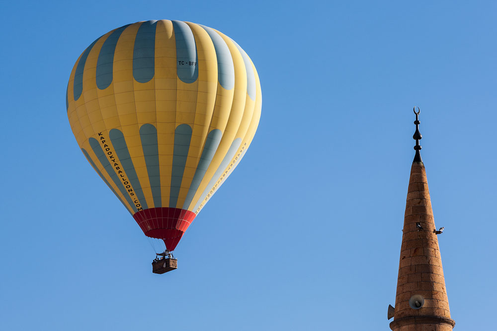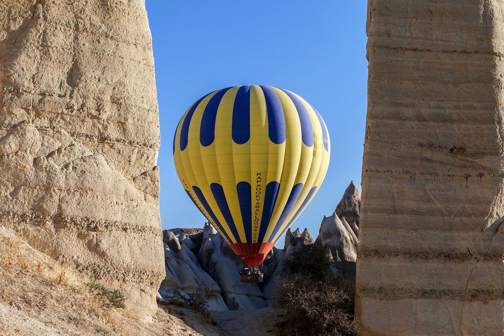 Schon aus der Ferne sieht man die einzigartigen Felsnadeln gen Himmel ragen. Ich höre das vertraute Rauschen eines Brenners und sehe einen Ballon ins Tal hinabsteigen – und dann kommen sie. Ich zähle 1, 2, 3, 4 und am Ende stehen mehr als fünfzehn bunte Ballons im Tal. Ich habe das Stativ aufgebaut. Es entstehen Bilder, die, wenn man sie aneinanderreihen würde, einen richtigen Kurzfilm ergeben würden. Zwischen zwei Felstürmen nähert sich ein Ballon in den blau/gelben Farben von Kapadokya Balloons, mit dem wir gestern noch durch die Lüfte glitten. Tatsächlich ist es Graham, der mich erkennt und mir zuruft: …“vergiß nicht mir ein Bild zu schicken !“