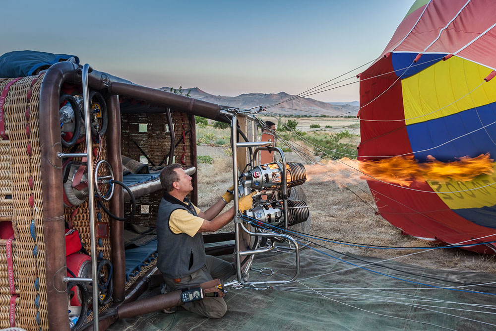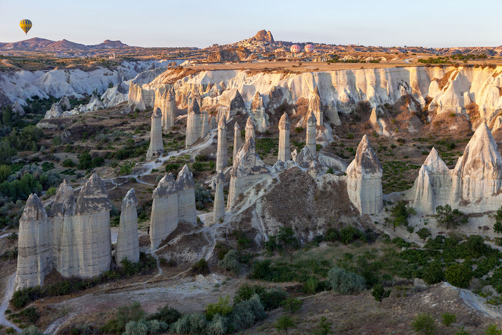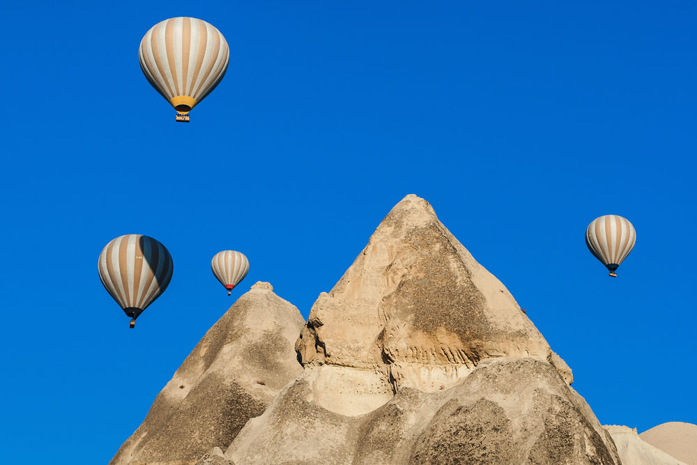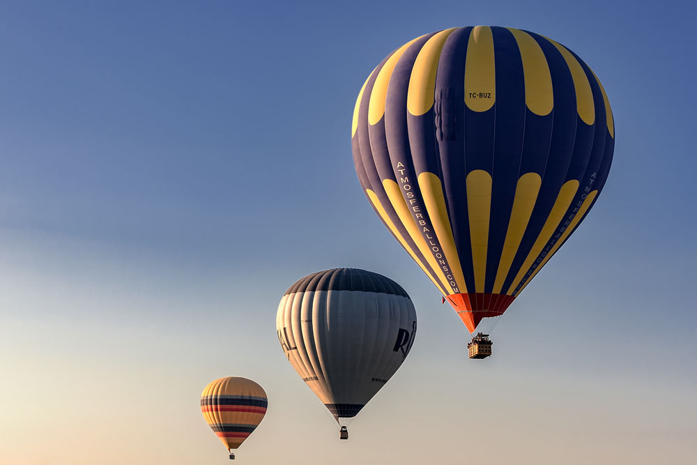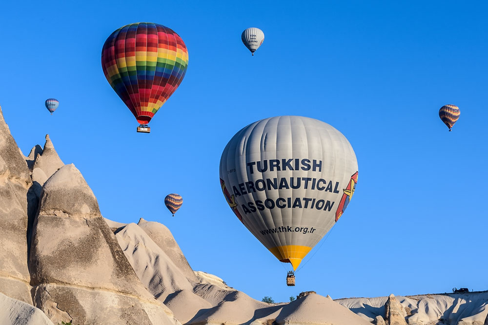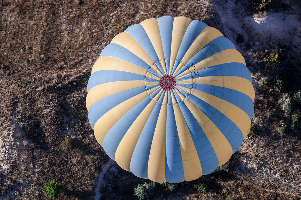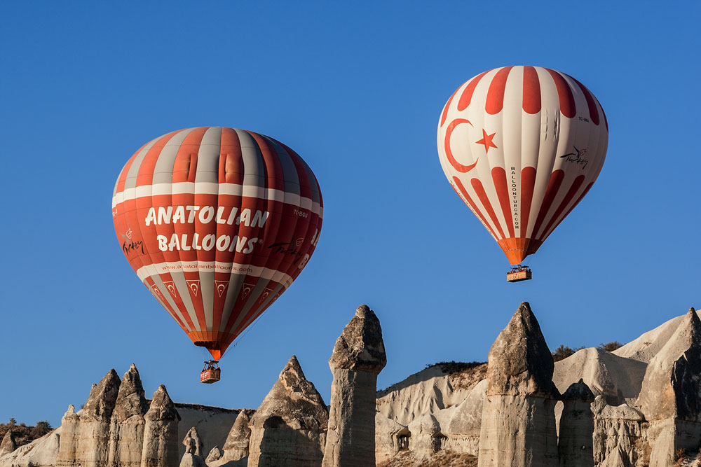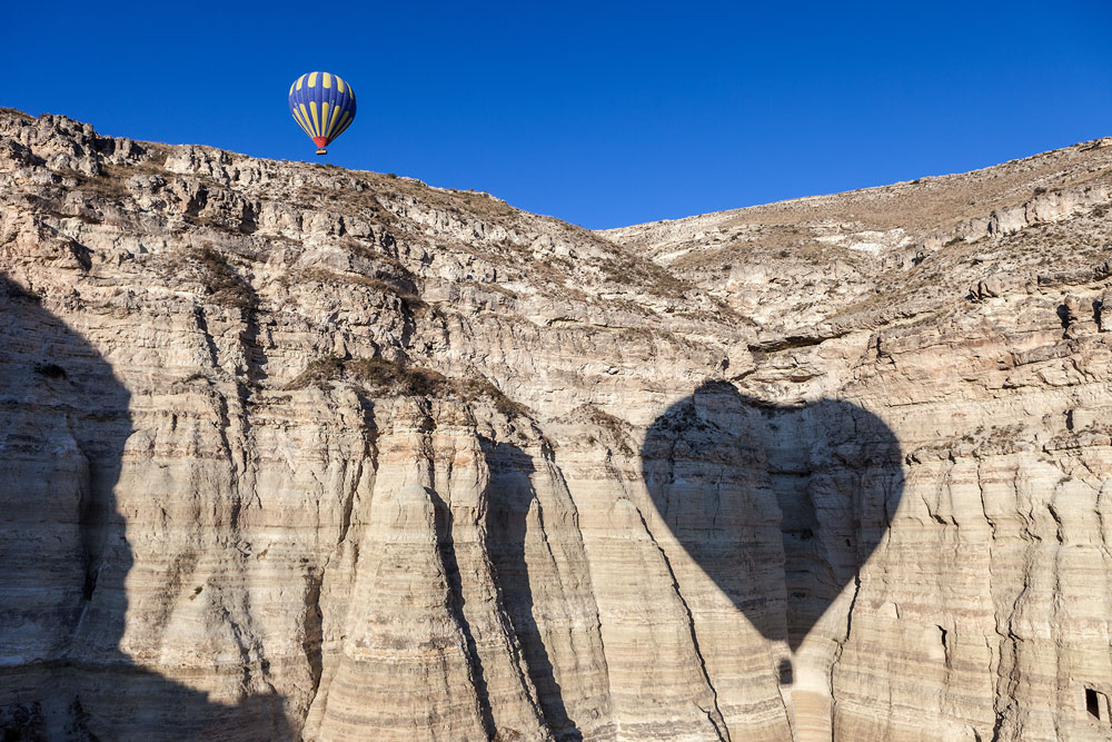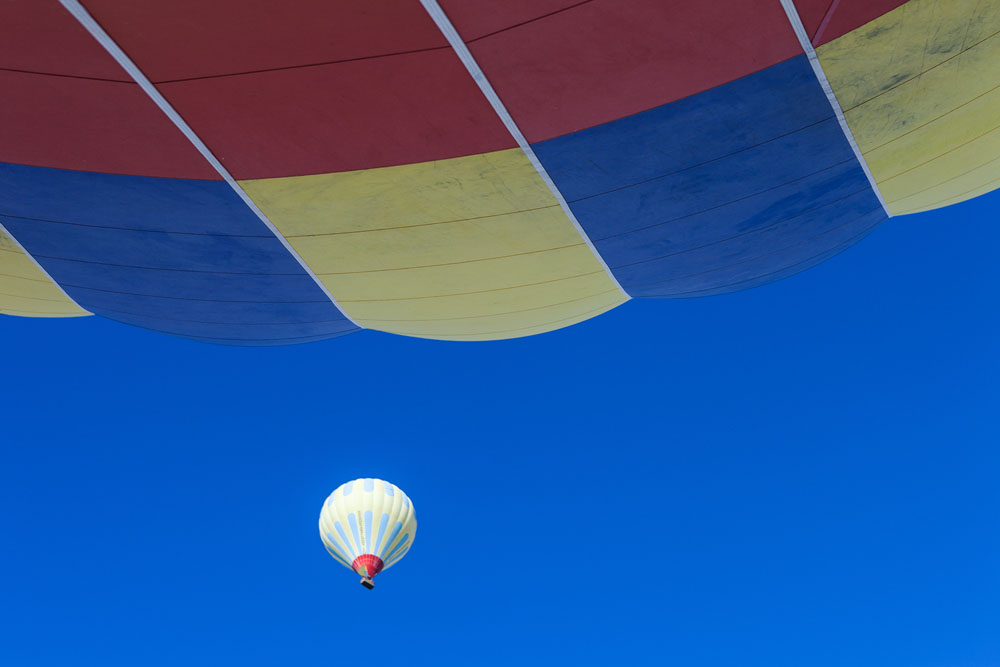 Schon aus der Ferne sieht man die einzigartigen Felsnadeln gen Himmel ragen. Ich höre das vertraute Rauschen eines Brenners und sehe einen Ballon ins Tal hinabsteigen – und dann kommen sie. Ich zähle 1, 2, 3, 4 und am Ende stehen mehr als fünfzehn bunte Ballons im Tal. Ich habe das Stativ aufgebaut. Es entstehen Bilder, die, wenn man sie aneinanderreihen würde, einen richtigen Kurzfilm ergeben würden. Zwischen zwei Felstürmen nähert sich ein Ballon in den blau/gelben Farben von Kapadokya Balloons, mit dem wir gestern noch durch die Lüfte glitten. Tatsächlich ist es Graham, der mich erkennt und mir zuruft: …“vergiß nicht mir ein Bild zu schicken !“