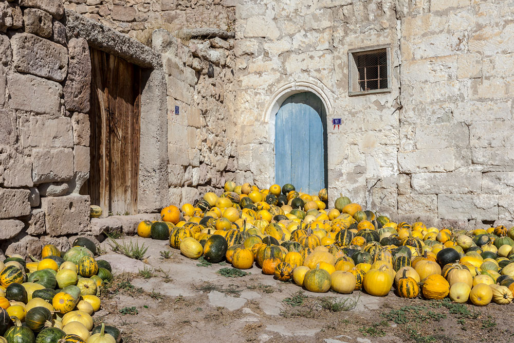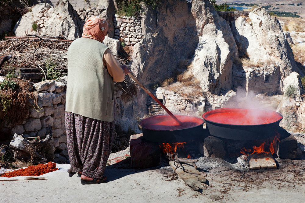 Wer das ursprüngliche Kappadokien erleben will, der muss in die Dörfer gehen. Jetzt im Herbst ist Erntezeit und es werden Vorräte für den bevorstehenden Winter werden angelegt. Auf einer unserer Wanderungen machen wir Mittagsrast in der kleinen Ortschaft Maziköy. Nicht weit vom Ortskern entfernt flackert ein kleines Feuer, auf dem ein großer Topf mit Bulgur brodelt. In einem Hinterhof sitzen Mütter mit ihren Kindern und pellen getrocknete Bohnenkerne aus der Schale. Ich frage: „foto çekebilir miyim ?“, aber die Frauen schütteln den Kopf. Trotzdem verweile ich noch ein wenig und befriedige die Neugier der Kinder. Dass dabei auch das eine oder andere Kinderportrait entsteht versteht sich, und es kommt dann wie es immer kommt. Der Schlüssel zum Herz einer Mutter führt über die Kinder. Die Mütter nehmen ihre Kleinen in den Arm und lassen sich zusammen ablichten. Das ist die große Stunde digitaler Fotografie. Der Portraitierte kann sich selbst sehen, was immer erheiternd ist. Und so haben wir zusammen viel Spaß, bis eine der Damen sich erhebt und sagt: „Wisst Ihr was, ich lade Euch ein. Kommt zu mir nach Hause auf ein Glas frischen Ayran – und ich zeige Euch wie wir leben“. Eine solche Einladung abzulehnen wäre zutiefst unhöflich, ja geradezu beleidigend. Auch im Hof vor Fatma’s Haus wird geköchelt. Ihre Töchter kochen Salça, die würzige Tomatensauce, die den Grundstock vieler leckerer türkischer Gerichte bildet. Fatmas Mann ist Kartoffelbauer und baut gerade einen Kartoffelkeller, der so groß ist, dass man mit großen Lastwagen hineinfahren kann. Einen Teil des Kellers nutzt er für die eigene Ernte, den Rest des Lagerraums vermietet er an die Nachbarn. Fatma kommt mit dem Ayran und einem Tablett reifer Birnen. Eine gefährliche Mischung aber lecker. Wir sitzen auf der Treppe vor dem Haus, reden über Gott und die Welt. Es bleibt die Erkenntnis, dass Ayran & Birnen nicht automatisch einen durchschlagenden Erfolg haben müssen und das wir Menschen uns verstehen, wenn wir uns nur ein wenig Mühe geben.