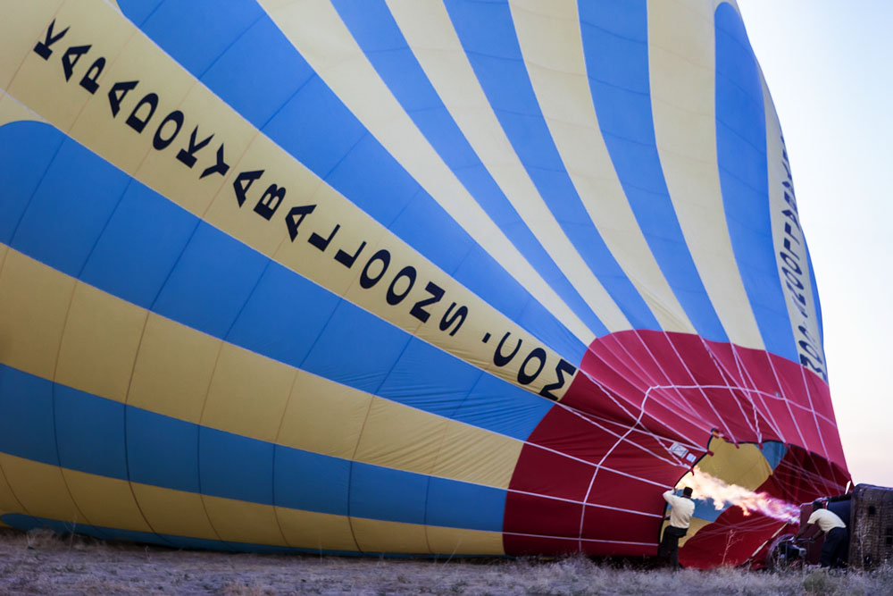 …in a beautiful balloon. So heißt es in einem Schlager aus der Flower-Power-Zeit. Für das Ballonfahren am kappadokischen Himmel wird viel Werbung gemacht. In den letzten fünfzehn Jahren haben sich viele Firmen etabliert und das Unternehmen „Ballonfahren“ ist straff durchorganisiert. Trotzdem wird dem Erlebnis nichts von seiner Faszination genommen. Wir haben bei Kapadokya Ballons eingecheckt und werden weit vor Sonnenaufgang mit dem Shuttlebus abgeholt. Nachdem wir beim Check-in in Göreme unsere Bordkarten abgeholt haben, steuern wir ein abgeerntetes Kürbisfeld nahe Ürgüp an. Hier stehen drei Körbe und die Crews sind schon dabei die Ballonhüllen auszulegen. Die Brenner werden angeworfen und ein Propeller lenkt die heiße Luft in die Hülle. Alle Handgriffe erfolgen besonnen und routiniert und nach gut dreißig Minuten hebt Graham, unser Pilot, mit uns ab. Als die Sonne über die Felskämme klettert stehen am Himmel mehr als vierzig Ballons in den verschiedenen Farben der einzelnen Ballooning-Unternehmen. Wir steigen auf und gleiten über Felder; unter uns liegen in glatt gerechten Kiesflächen, Weinstöcke und aufgehäufte Kürbisse. In der Ferne sieht man den machtvollen Burgberg von Uçhisar, den „Kale“. Graham betätigt den Brenner. Flammen schlagen aus den Düsenstöcken, erwärmen die Luft und der Ballon steigt weiter. Wir nähern uns Çavusin und können die Landschaft, die wir zu Fuß erkundet haben von oben entdecken. Langsam senkt sich der Ballon über eine Felskante, und wir treiben ins Love-Valley hinein. Graham steuert das Ungetüm mit Präzision, Virituosität und der Leichtigkeit als sei es ein Fahrstuhl. Wir sinken zwischen die Felsnadeln und steigen wieder auf, wie in einem Lift. Schroffe Felsen und andere Ballons sind zum Greifen nahe. Die Ballonfahrt in der grandiosen Landschaft ist ein Erlebnis, das man nie vergisst. Nach anderthalb Stunden landen wir sanft auf einem Feld. Die anschließende Zeremonie mit Champagner und Kuchen bringt uns ein wenig zurück in die lärmende Welt der Menschen und weg von der himmlischen, majestätischen Ruhe am Himmel.