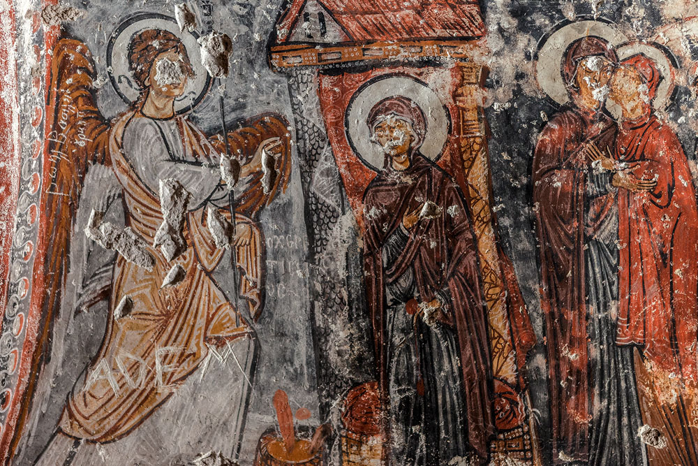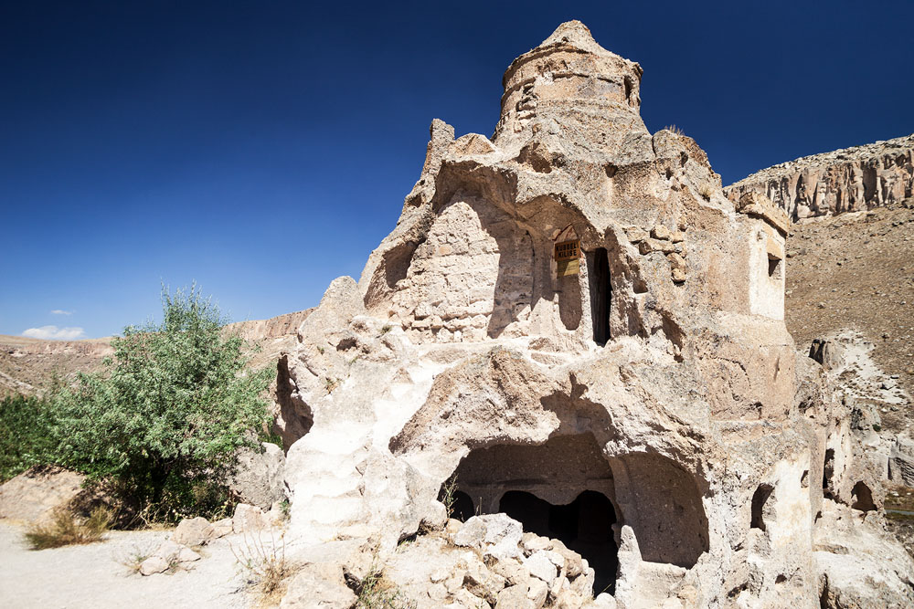 Die Kirchen im Freilichtmuseum von Göreme sind sicher die am besten erhaltenen und restaurierten, aber auch die meist frequentierten. Auch in der Nebensaison stauen sich hier die Busse mit Kurzausflüglern, die Kappadokien auf Ausflügen von Antalya oder Istanbul aus „nebenbei mitnehmen“. Wir entscheiden uns für die Kirchen im Soğanli-Tal, etwas abgelegener, wenig besucht, nicht so prächtig aber dennoch spektakulär. Das Tal kann man sich erwandern. Rechts und links der Talsohle, teilweise in nur geringem Abstand zueinander, findet man die Kirchen: Karabaş, Yilanli, Kubbeli, Sakli und St. Barbara. Herausragend ist die Yilani – Klilise, was übersetzt soviel heißt wie Schlangenkirche. In der Tat muss man ein Schlangenmensch sein, um sich durch den engen Eingang und die Durchlässe im Inneren zu quetschen. Die Innenräume der Höhlenkirchen sind schlicht. Nur wenig Licht fällt von außen hinein. Wie anders muss dieser Glaube gewesen sein – bescheiden, demütig; verglichen mit den hochfahrenden, prächtigen, Licht durchfluteten Kathedralen Europas. Von den Deckenfresken und Wandmalereien ist wenig geblieben. Islamische Bilderstürmer haben den Heiligen die Augen ausgekratzt und viele Jahrhunderte lang haben die Stätten inbrünstiger Frömmigkeit als Stallungen für Schafe und Ziegen herhalten müssen. Unergründlich bleibt, warum so viele Kirchen auf so engem Raum aus den Felsen geschlagen wurden, oftmals in Sichtweite zueinander.