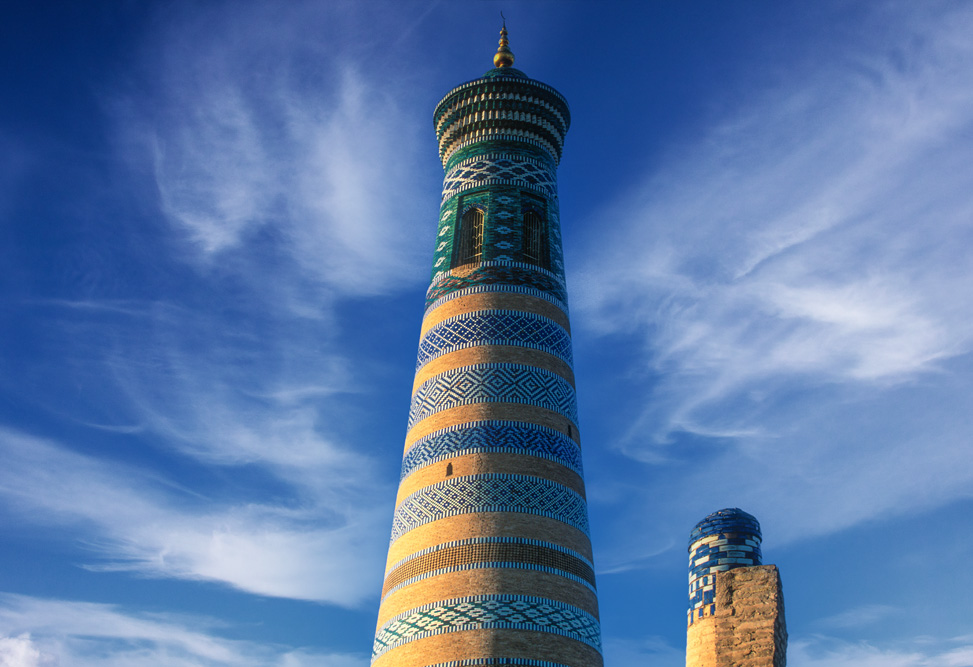 Chiwa – Es ist dunkel als wir ankommen. Das kleine, gemütliche Hotel Malika liegt genau gegenüber dem Tor Ota Darvoza, durch das man in die Altstadt Ichalan Kala gelangt. Die Nacht ist sternenklar, der nahende Morgen bitterkalt. Trotzdem sind wir beim ersten Sonnenlicht unterwegs in dieser Museumsstadt, deren Minarette weit über die Stadtmauern hinweg sichtbarer Fixpunkt für ankommende Karawanen war. Chiwa trägt den Beinamen „Leuchttürme in der Wüste“ und so falsch ist dies nicht. In alter Zeit wurden des Nachts Feuer auf den Kronen der Minarette entzündet um den Karawanen den Weg zu weisen. Chiwa blickt auf 2.500 Jahre Geschichte zurück. Der Kern der Stadt stammt aus dem 14.-Jahrhundert und die meisten Prachtbauten aus dem 17.Jahrundert, als Chiwa Hauptstadt des Khanats wurde.