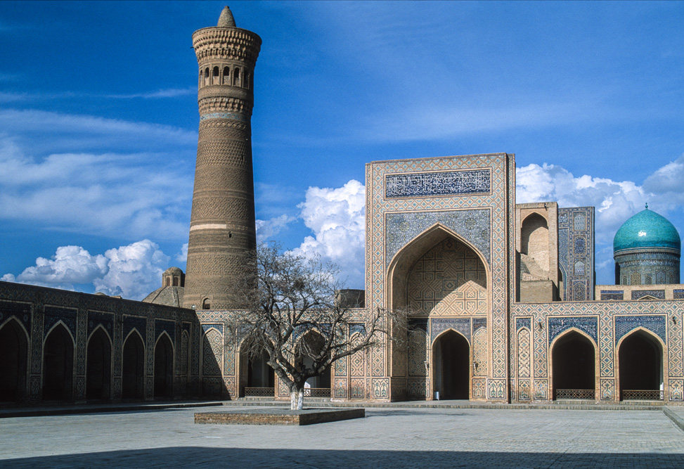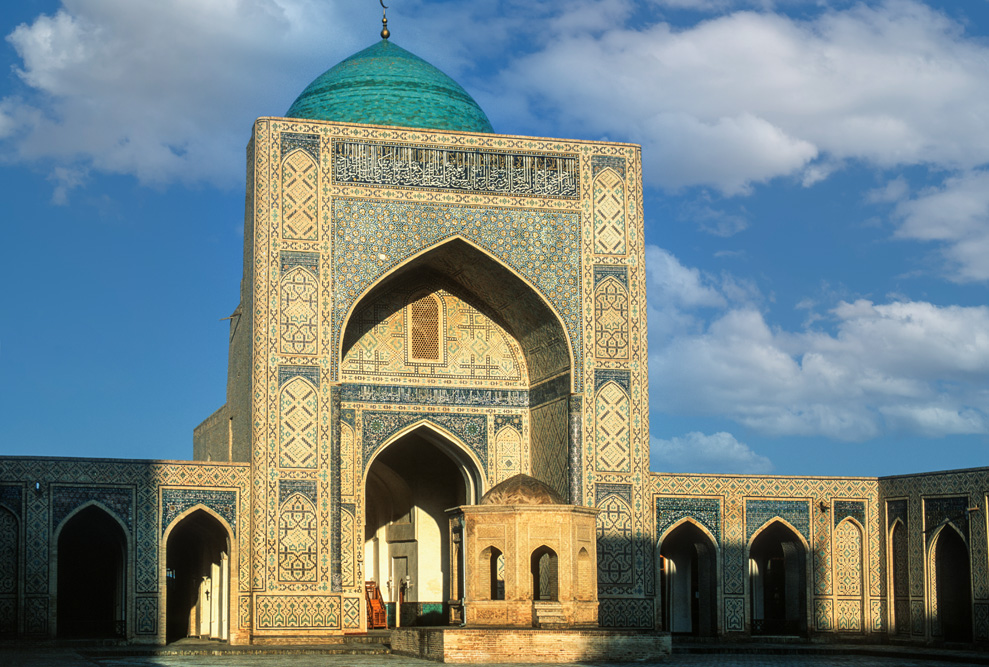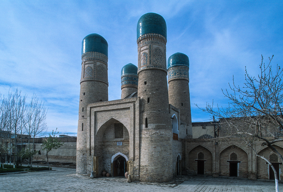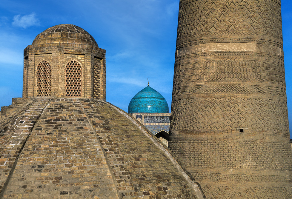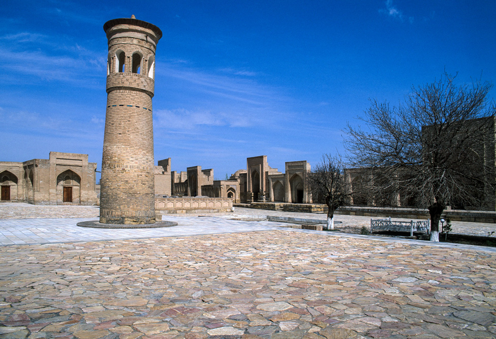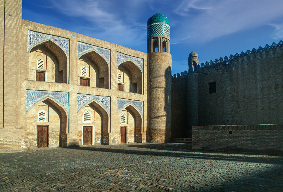 Als ich das Hotel verlasse, bin ich schon nach wenigen Metern mitten auf einem kleinen Basar. Die Händler und Handwerker sind freundlich und angenehm unaufdringlich. Das Angebot reicht von Lackmalereien über geschnitzte Koranständer, Seide, Irdenwaren bis hin zu Gewürzen und Messern, für die Buchara weltberühmt ist.Mein Ziel in der frühen Morgenstunde ist die Miri-Arab-Medrese und die Kalon Moschee. Am frühen Morgen ist es menschenleer. Die aufgehende Sonne taucht das 46 m hohe Minarett, das seit dem Jahr 1127 Wahrzeichen der Stadt ist, und die blauen Kuppeln der Medrese in ein warmes Licht. Ich verweile ganz gefangen von diesem Anblick, der mit jeder Minute, die die Sonne höher steigt, grandioser wird.