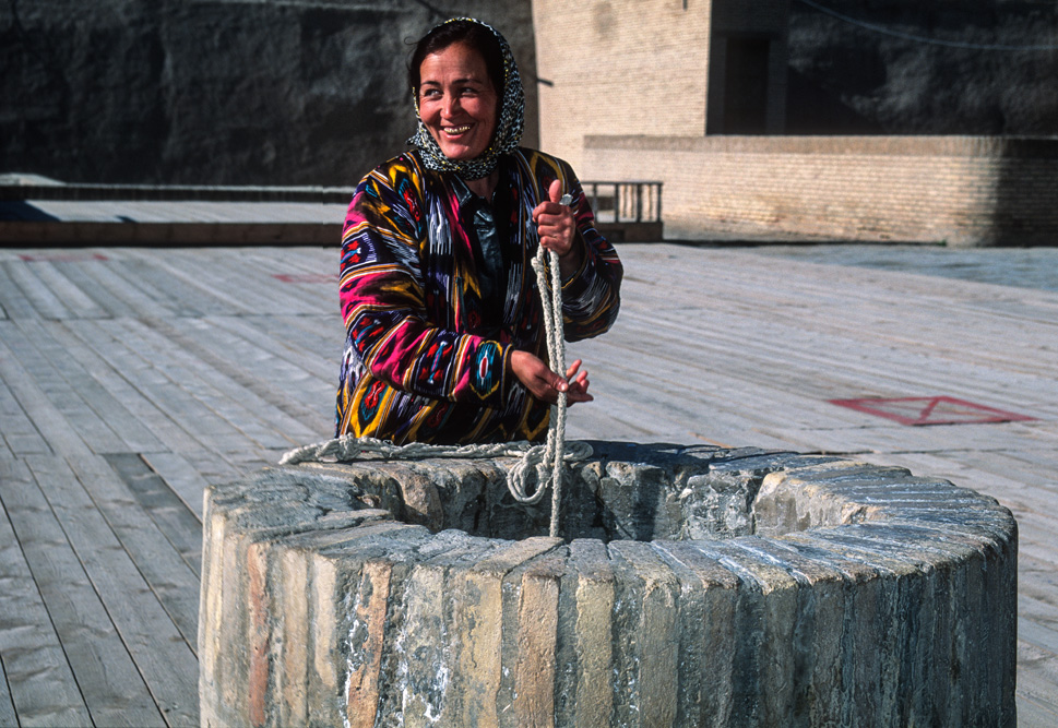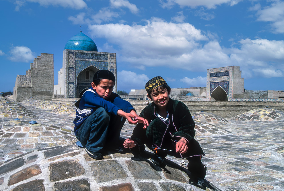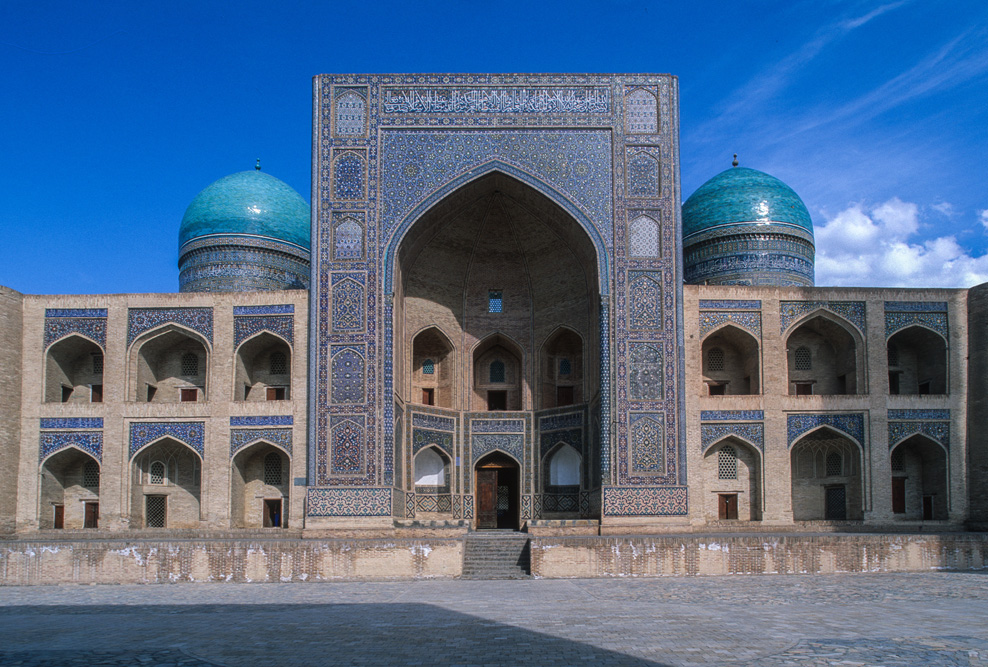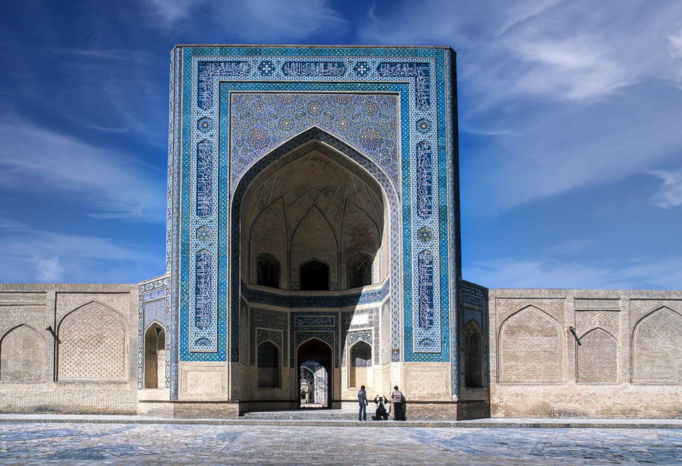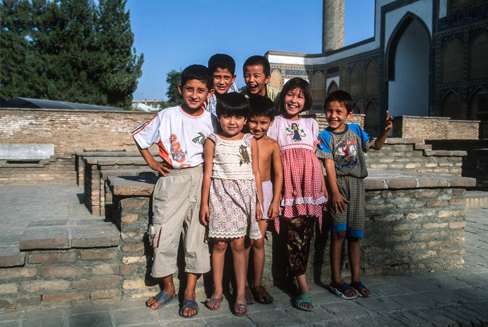 Wir wohnen mitten in der Altstadt. Als die Sonne am nächsten Morgen durch das Fenster scheint, fällt mein Blick auf das Eingangstor der Ulug’bek-Medrese. Ulug’ bek der Enkel Timurs war weniger Krieger als Wissenschaftler und Schöngeist. In das Majolika-Mosaik des Portals ließ er einmeißeln „Das Streben nach Wissen ist die Pflicht eines jeden Moslem und einer jeden Muslime“. Genau gegenüber liegt die Medrese Abdulasiz Chan. Auch wenn wir vom Lehrbetrieb dieser Koranschulen wenig wissen, so scheint die Einbeziehung der Frau in den Kreis der Wissenden doch für einen aufgeklärten Islam zu sprechen, und diese Glaubenshaltung finden wir auch immer in unseren Begegnungen mit den Menschen. Keine verschleierten Frauen; offenes Zugehen auf den Fremden und keinen verbissenen Umgang mit dem Glauben.