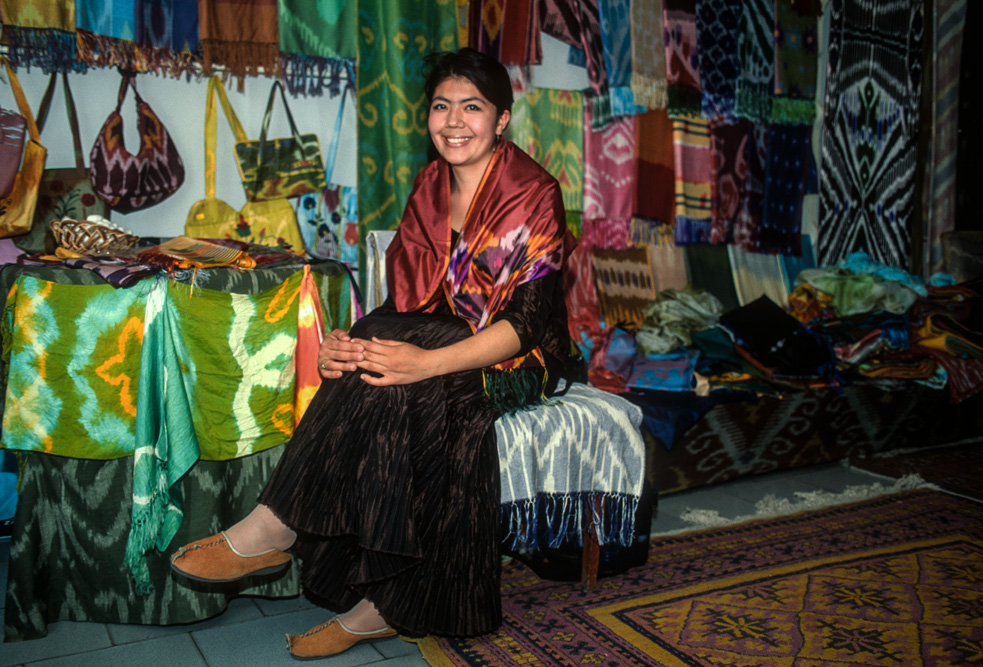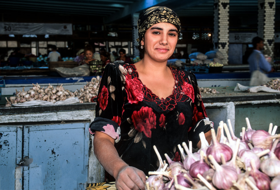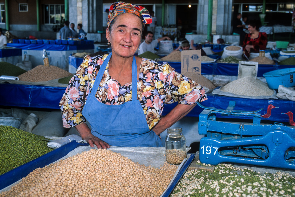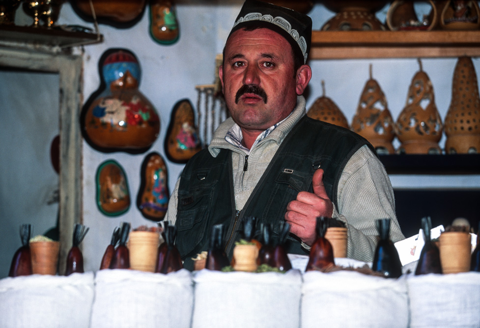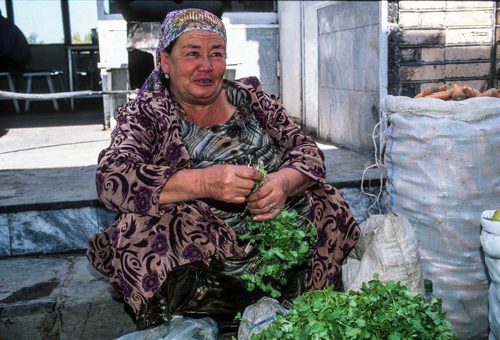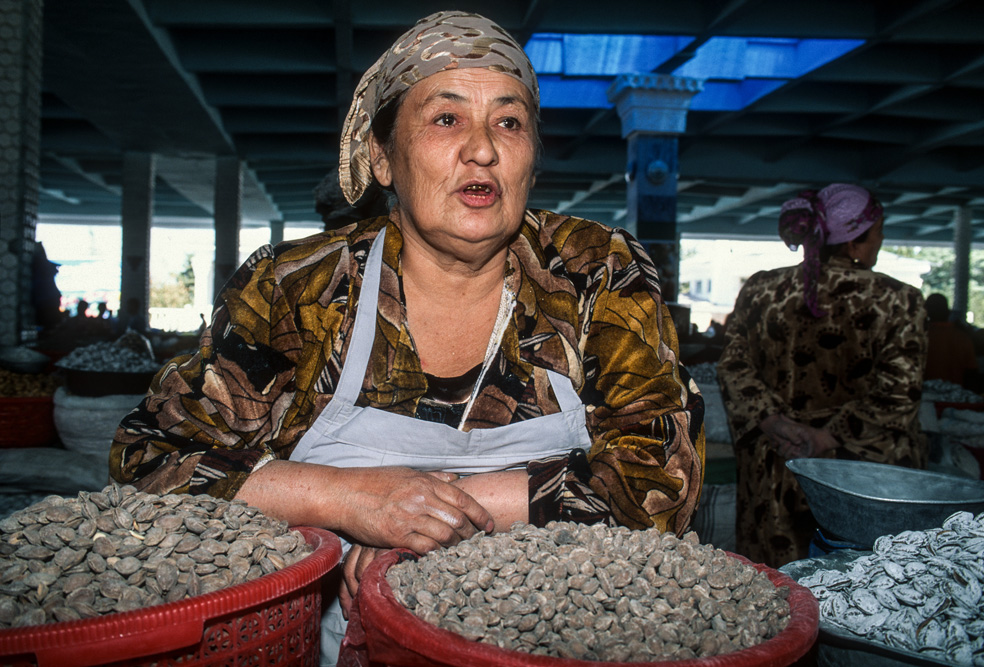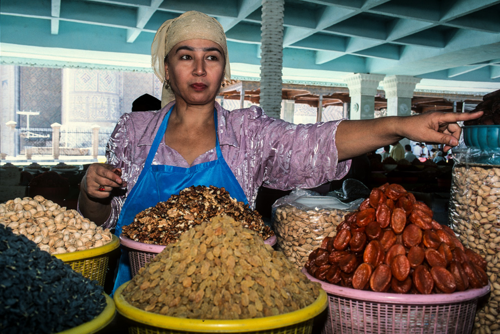 Ein orientalischer Basar ist etwas besonderes, weniger Marktplatz denn Lebensform. Die Händler haben Menschenkenntnis und Lebenserfahrung, sie taxieren dich, schätzen deine Kaufkraft ein – an ihnen hätte Sigmund Freud sein Vergnügen. Alle Wohlgerüche des Orients fluten einem entgegen, doch hier ist nicht nur der Geruchssinn gefragt, hier gilt es mit allen Sinnen zu genießen. Auf dem Gewürzbasar stehen die Händler und lassen Sesamsamen durch die Finger rieseln, hier gibt es Pfeffer, Safran, Muskatpulver, Nelken und Sternanis, Rosinen und getrocknete Aprikosen. Das ist morgenländische Exotik im Überfluss. Weiter hinten in den kühleren Ecken des Basars werden Käsekugeln eingesalzen. Wohlgenährte Frauen thronen hinter Gemüseständen. Es werden Radieschen geputzt, Möhren in Streifen geschnitten und in Knoblauchsud eingelegt und Granatäpfel aufgebrochen. Es tut mir immer leid, dass man als Fotograf ein bisschen ein Schmarotzer ist. Man will die bunten Bilder, kann aber nicht jedem etwas abkaufen. Bei den Händlern von Samarkand habe ich aber kein schlechtes Gewissen, sie sind freundlich und ich bekomme sogar ein frisches, knuspriges Fladenbrot geschenkt. So gestärkt, mache ich mich auf zur letzten Etappe in Samarkand.
