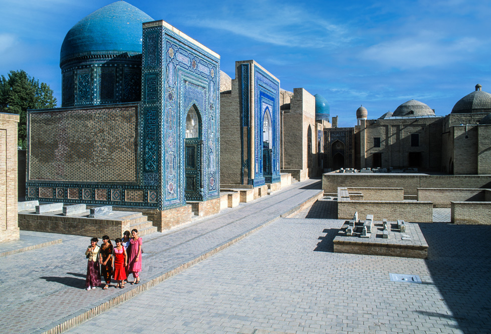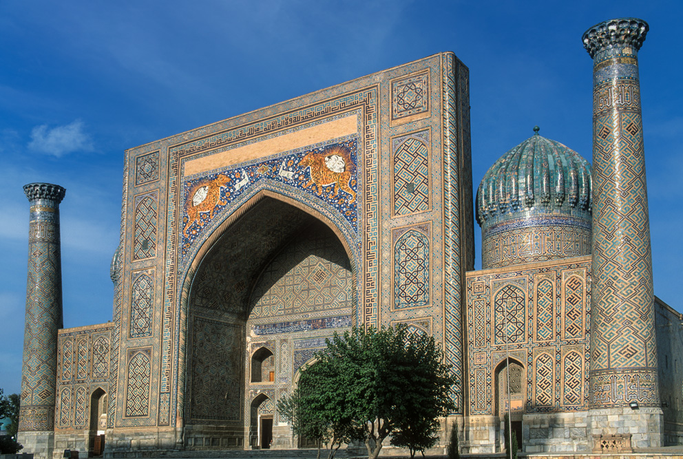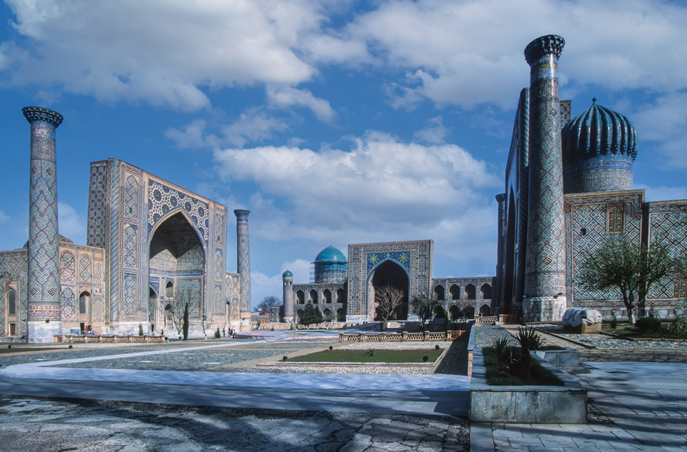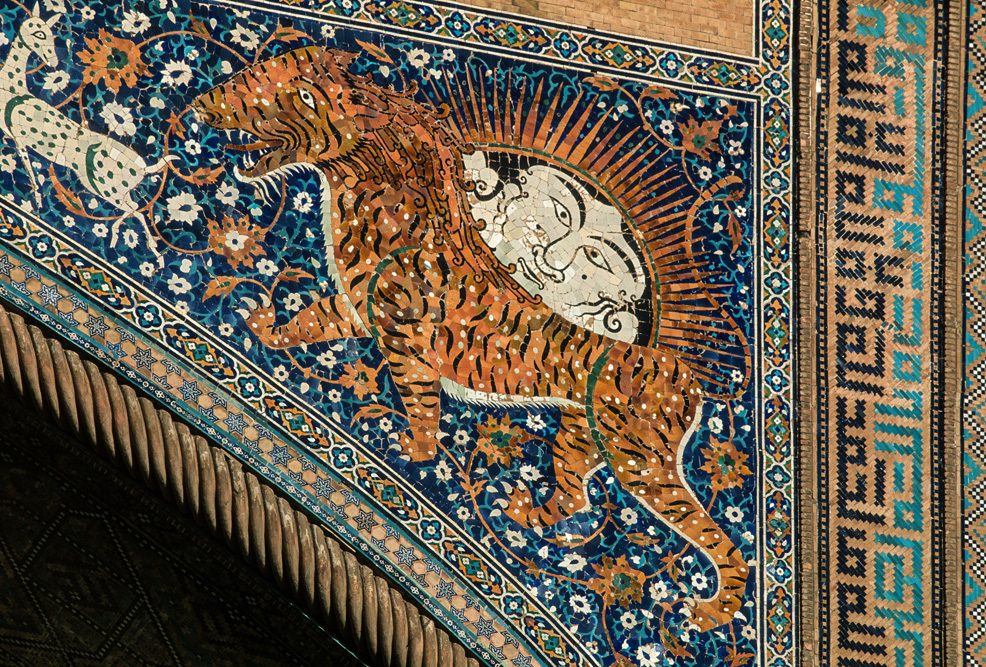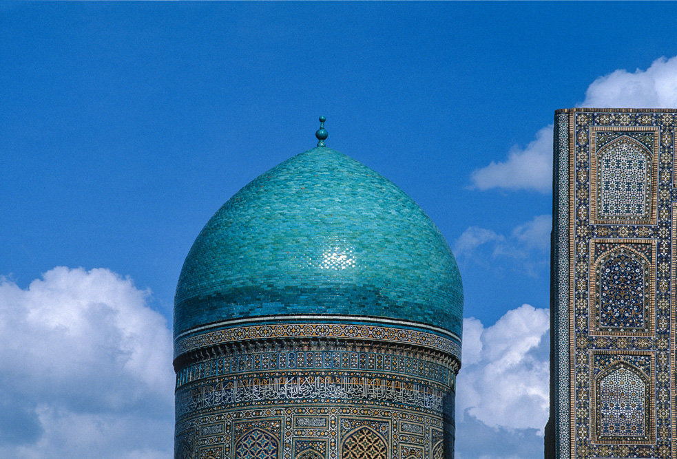 Absolutes Glanzlicht ist der Registan, an dem alle Timuriden-Herrscher bauten. Im Laufe der Zeiten entstanden und verschwanden hier die unterschiedlichsten Zweckbauten, während in der Herrschaftszeit Timurs hier Medresen, Karawansereien und Moscheen standen, sind es heute die Medresen Ulug’ bek, Sherdor und Tillakori, die den Platz ausmachen. Zu den verschiedenen Tageszeiten erscheinen die Verzierungen auf den Iwanen in unterschiedlichem Licht. Neben der floralen Ornamentik des Islam finden sich auch figürliche Darstellungen mit Anklängen aus vor- islamischer Zeit, wie die Löwen an der Sherdor-Medrese aber auch Sonnensymbole, wie das Hakenkreuz, das eigentlich eher in die Mystik der Zoroastrier gehört. Den Namen des Enkels Timurs, Ulug’bek trägt die dritte Medrese und ist passend zu seinen wissenschaftlichen Neigungen mit Sternenmotiven verziert.