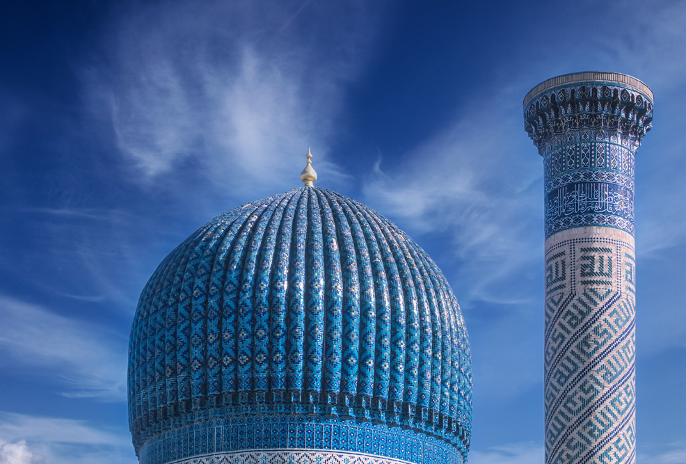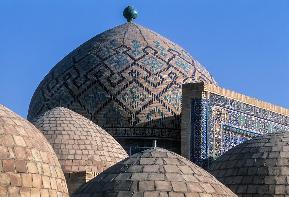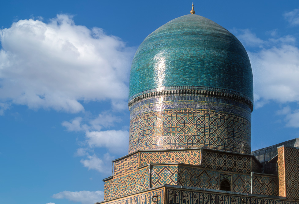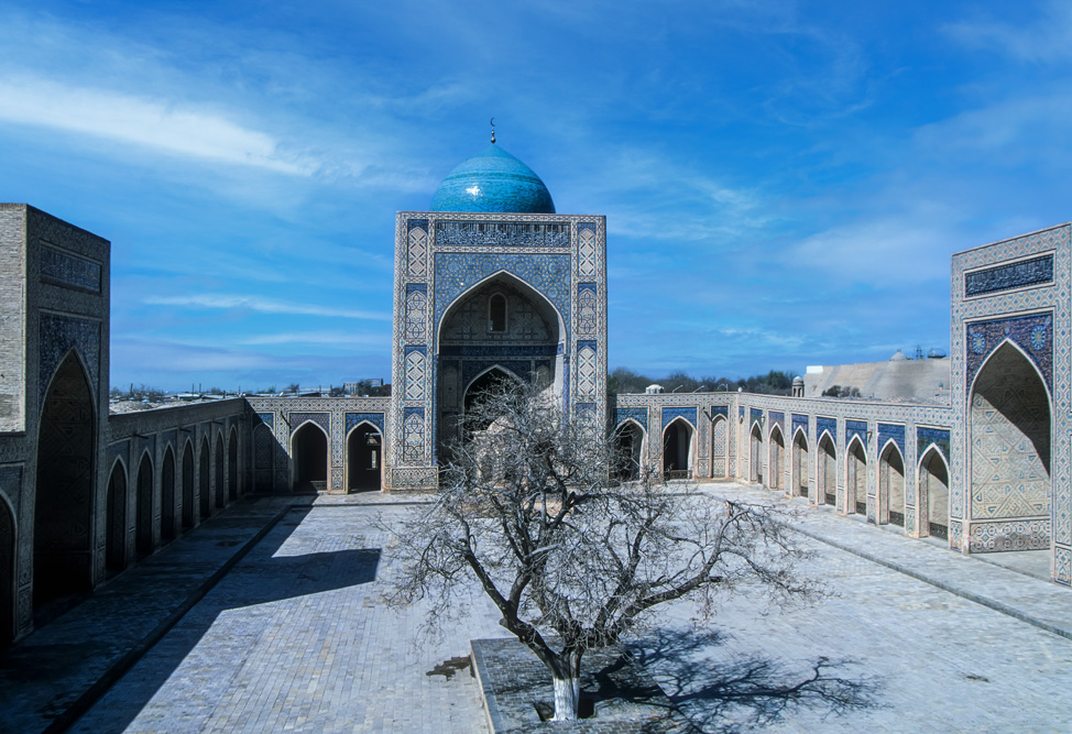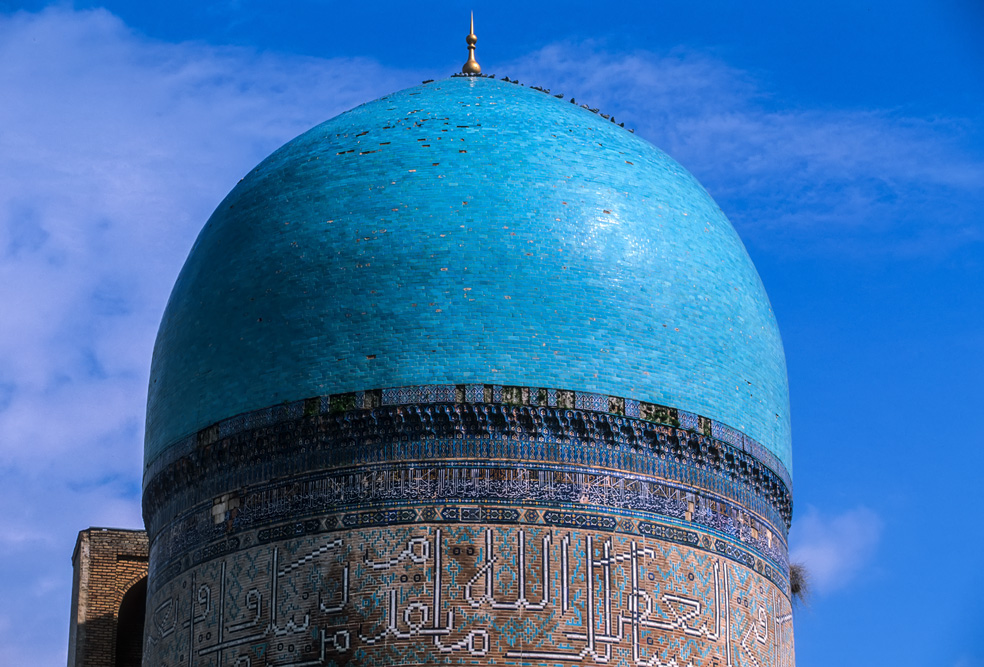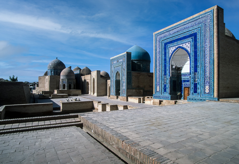 Absolutes Glanzlicht ist der Registan, an dem alle Timuriden-Herrscher bauten. Im Laufe der Zeiten entstanden und verschwanden hier die unterschiedlichsten Zweckbauten, während in der Herrschaftszeit Timurs hier Medresen, Karawansereien und Moscheen standen, sind es heute die Medresen Ulug’ bek, Sherdor und Tillakori, die den Platz ausmachen. Zu den verschiedenen Tageszeiten erscheinen die Verzierungen auf den Iwanen in unterschiedlichem Licht. Neben der floralen Ornamentik des Islam finden sich auch figürliche Darstellungen mit Anklängen aus vor- islamischer Zeit, wie die Löwen an der Sherdor-Medrese aber auch Sonnensymbole, wie das Hakenkreuz, das eigentlich eher in die Mystik der Zoroastrier gehört. Den Namen des Enkels Timurs, Ulug’bek trägt die dritte Medrese und ist passend zu seinen wissenschaftlichen Neigungen mit Sternenmotiven verziert.