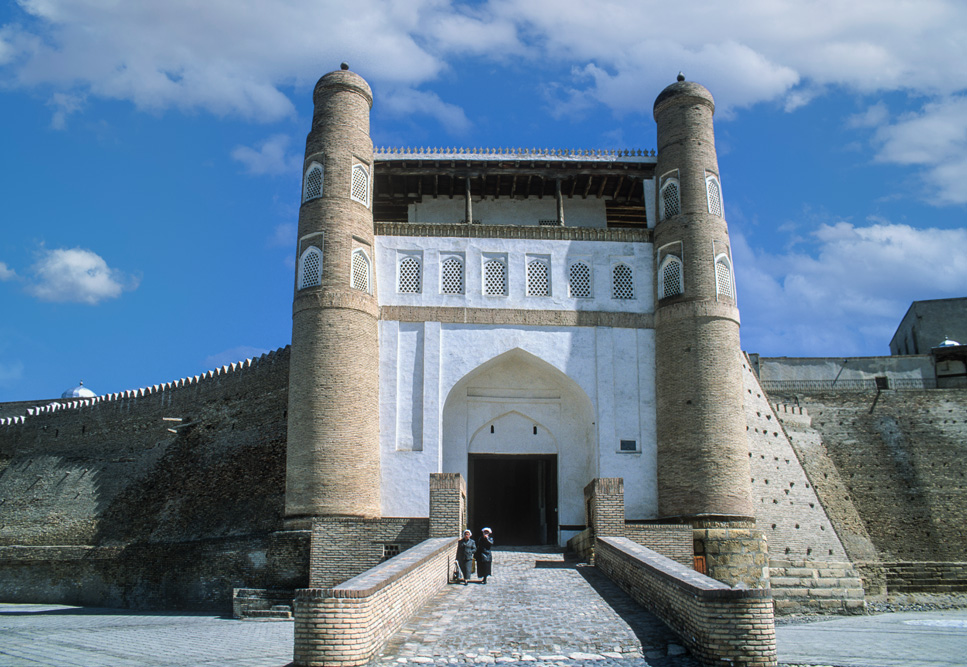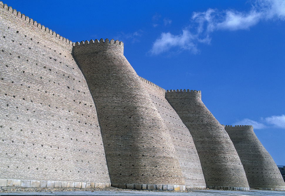 Am Ausgang des Goldbasars beginnt die Festungsmauer des Ark, eine befestigte Residenz der Herrscher von Buchara, in die man sich bei Angriffen hätte zurückziehen können. Mit gut 35.000 m² Fläche hatte der Khan jedenfalls Platz genug um all seine Schätze unterzubringen. Wenige Schritte von der Zitadelle entfernt liegt die Bolo Hauz Moschee, deren Vordach von 20 massiven, geschnitzten Holzsäulen getragen wird. Im Wasser des davorliegenden Bassins spiegeln sich die Säulen.Das Gebäude erinnert mich ein wenig an den 40-Säulen-Palast in Isfahan.