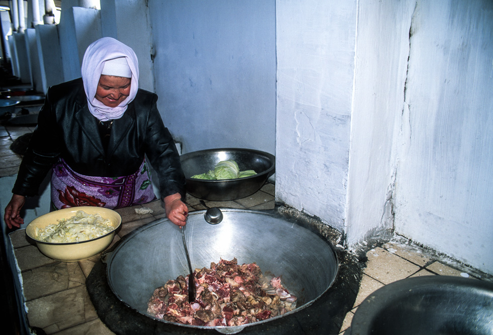 Gleich neben dem Heiligtum gibt es die üblichen Stände mit Devotionalien, Schriften Nahshbandis, Amulette gegen den bösen Blick, eben all die Kleinigkeiten, die das Herz eines Pilgers höher schlagen lassen. Von irgendwoher dringt ein intensiver Duft von gebratenem Fleisch mit Zwiebeln. Wer der Nase folgt, kommt in eine große Gemeinschaftsküche für die Pilger. Hier lässt man sich gerne in die Töpfe gucken und wird herzlich eingeladen.