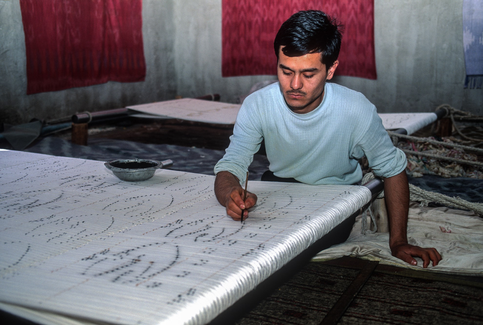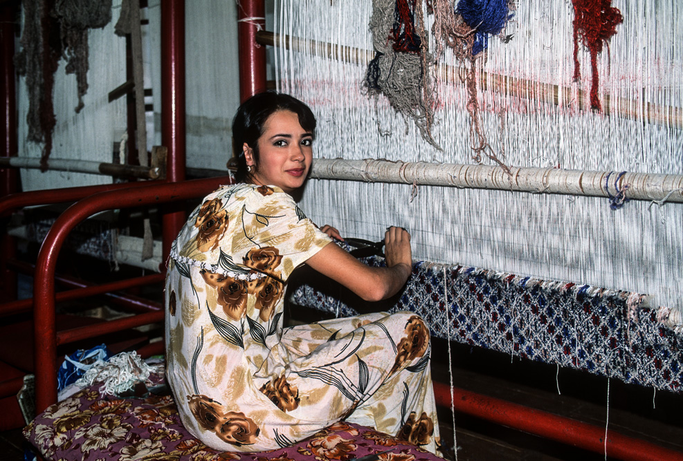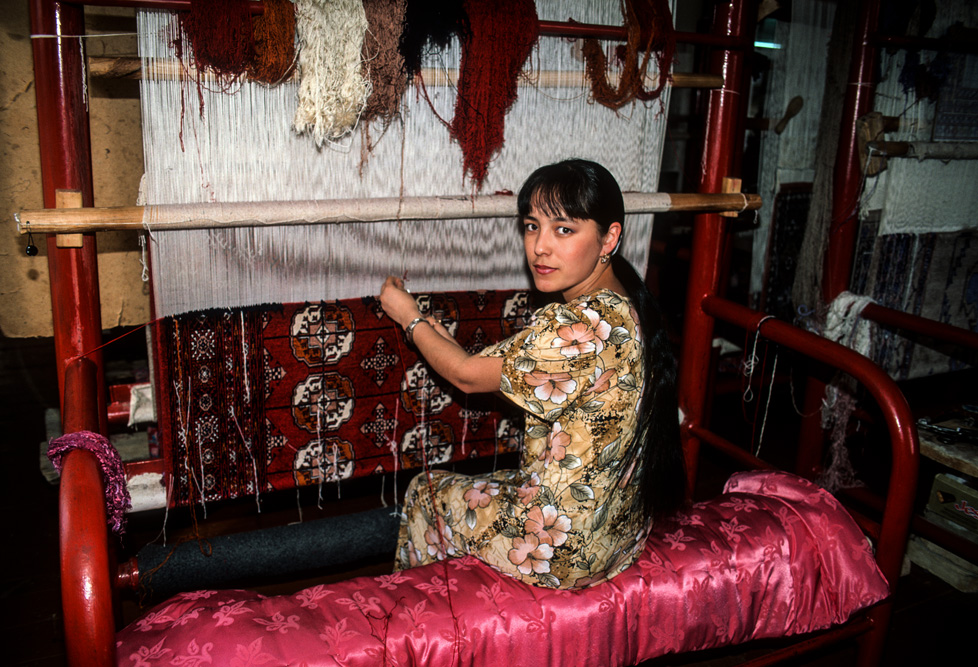 In einem großen Raum stehen Handwebstühle und nette Mädchen lassen fröhlich das Schiffchen fliegen. Das Design, das hier gewoben wird ist sehr usbekisch. Kräftige Farbkompositionen, mit großen, flächigen Mustern. Das Fotoshooting ist eine willkommene Abwechselung und die Girls haben Ihre Freude an dem Spaß.