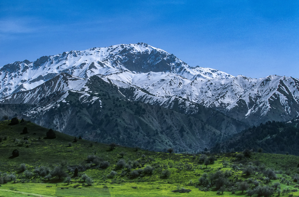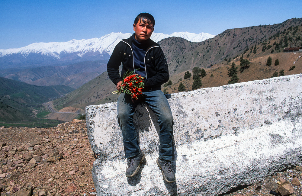 … das gut 300 km von Tashkent entfernt liegt. Ins Fergana-Tal zieht es nur wenige Touristen, die meisten scheuen die mühsame Anreise über Land in den kleinen zwischen Tadschikistan und Kirgisien eingeklemmten Zipfel Usbekistans. Die Straßen sind schlecht, die Pässe hoch und die umliegenden Gipfel schneebedeckt. Über 4.000 m ragen hier die Ausläufer des Pamir in den Himmel. Ein Paradies für jeden Trekking-Fan. Es gibt vereinzelte Militär- und Polizeiposten im Gebirge, die darüber wachen, dass „schlechte Gedanken“ weder importiert noch exportiert werden. Wie in aller Welt, fristen die Bergbauern ein karges Los. Kleine Buben und Mädchen stehen am Rande der Passstraße und verkaufen für wenige Sum Sträuße mit roten Wildtulpen, die sie auf den Almwiesen gepflückt haben.