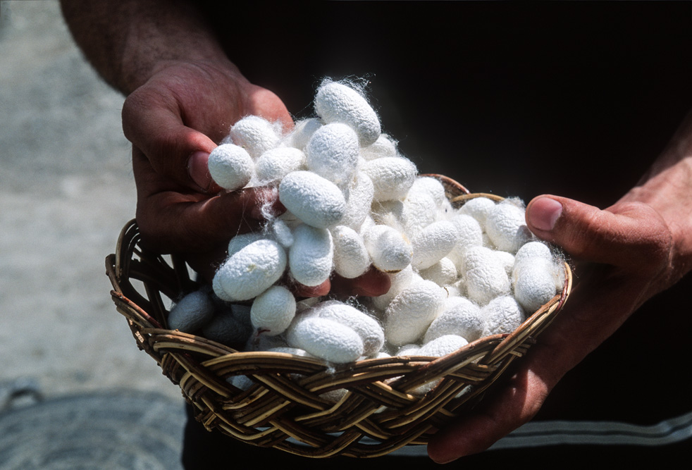 Das Fergana-Tal ist ein Land des Überflusses. Mitte April tragen die Maulbeerbäume bereits das erste Grün und stehen kurz vor der Blüte. Auf diesen Böden gedeiht alles, Aprikosen, Tomaten, Zwiebel, Baumwolle und Kürbis. Doch in der Hauptsache ist die Fergana-Region für die Seidenproduktion bekannt.