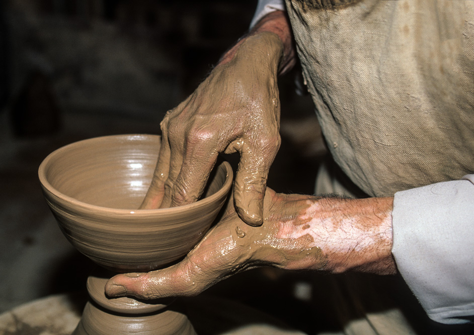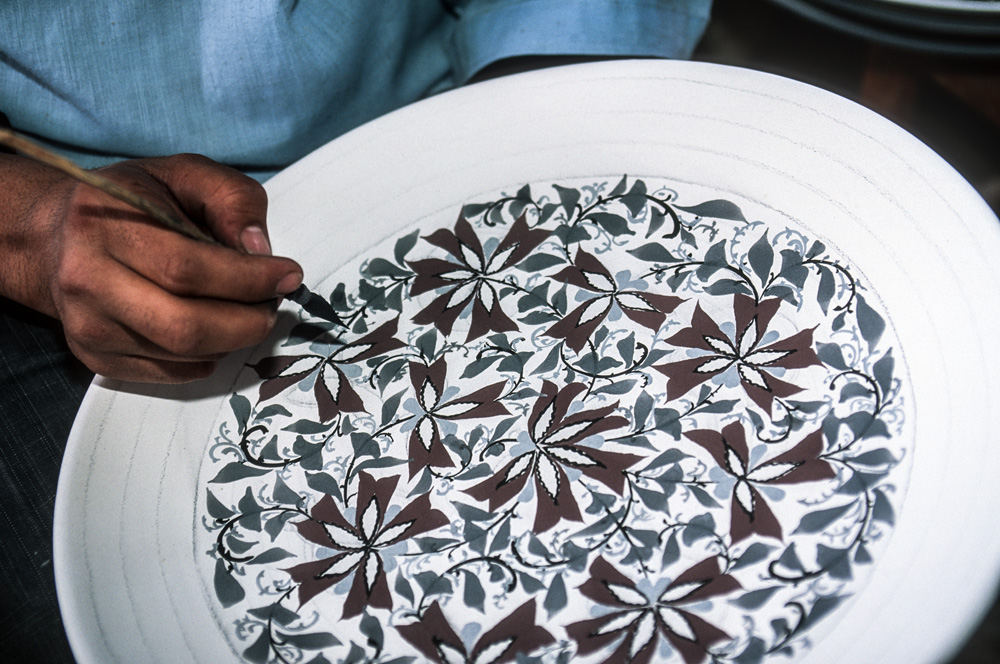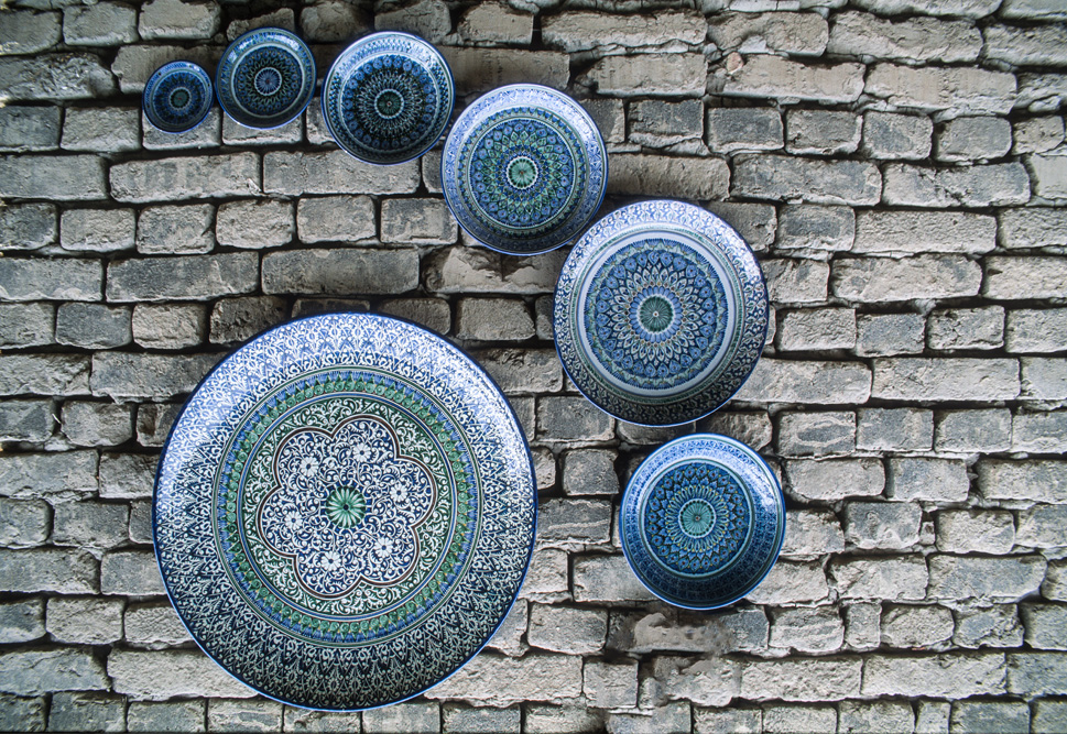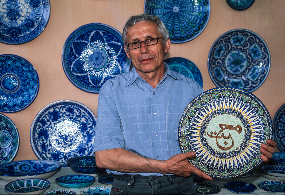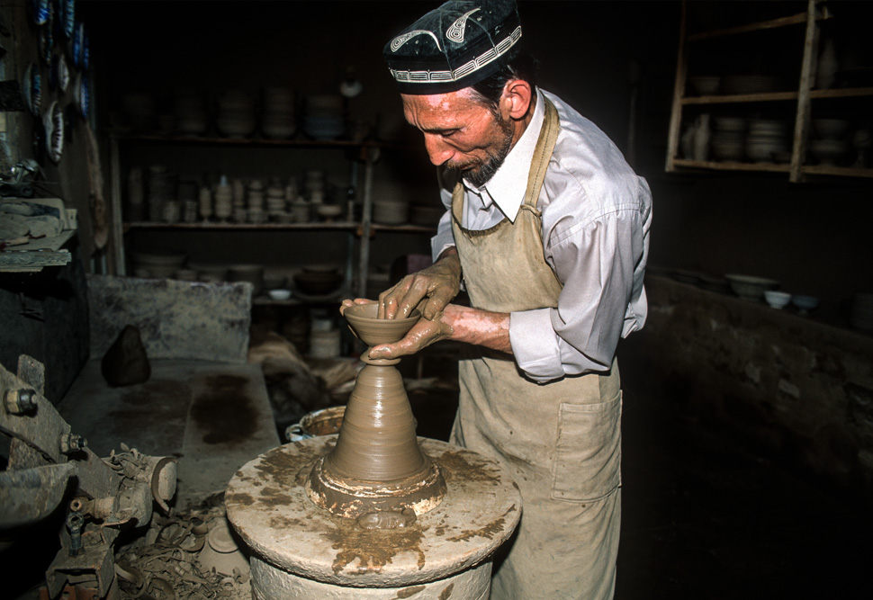 Rustam empfängt mich am Tor zu seiner Werkstatt. Im Augenblick wird ein neuer Brennofen aufgemauert. Daher nicht gebrannt und glasiert. Er lädt mich fast entschuldigend zum Essen ein. Seine Frau kredenzt den besten Plov, den ich je gegessen habe und natürlich auf selbst getöpferten Tellern und schalen. Darin wird wohl das Geheimnis liegen. Auch wenn nicht gebrannt wird, sind die Töpfer und Maler bei der Arbeit und lassen sich dabei gerne über die Schulter schauen. Rustam präsentiert seine Schöpfungen voller Stolz; nicht zu unrecht und er verkauft auch einiges. Die zerbrechlichen Kannen, Schalen und Teller werden gut gepolstert und flugtauglich verpackt. Das erinnert mich daran, dass es morgen Nacht von Taschkent aus wieder in die Heimat geht.