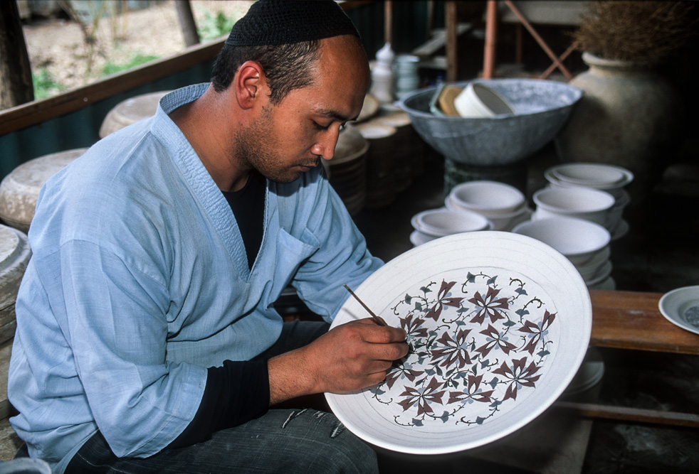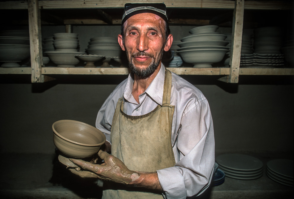 Von Margilan nach Rishlan sind es nur rund 50 km. Tadschikistan liegt vor der Tür. Hier wird die Absurdität der in den 20er Jahren von Moskau gezogenen Grenzen deutlich. Beiderseits der Grenze leben Minderheiten der unterschiedlichsten ethnischen Gruppen. Usbeken, Tadschiken, Turkmenen, Kasachen, Kirgisen und Russen. Zusammenhängende Strukturen wurden nach dem Zusammenbruch der Sowjetunion auseinandergerissen Beiderseits der Grenzen ist die Arbeitslosigkeit hoch. Es gibt Streit um Wasser und Bodenschätze. Rishlan ist ein Zentrum der Töpferei. Ich will Rustam Usmanov besuchen, dessen Keramik-Manufaktur weit über die Grenzen des Fergana-Tales bekannt und geschätzt wird. Seine Kreationen haben Ihren Weg in die Touristenzentren nach Samarkand und Buchara gefunden. Rishlan ist gekannt für sein blaues Keramikdesign.