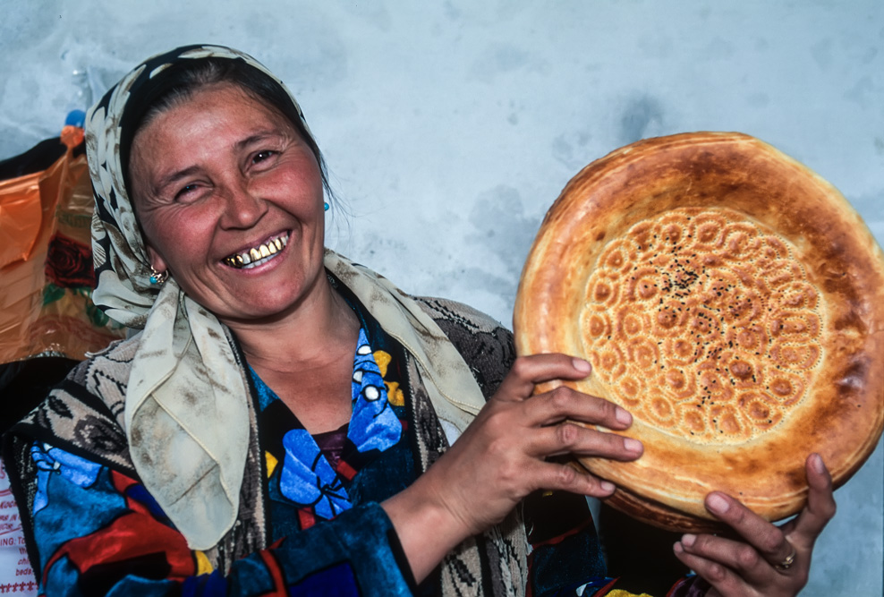 Auf der anderen Seite der Berge öffnet sich das Tal in eine weite, fruchtbare Ebene. Bei Kokand machen wir Pause in einem Rasthaus. Hier ist in wahrstem Sinne des Wortes „Gegenverkehr“. Auf der einen Seite der Straße hängen beim Schlachter die Lammkeulen am Haken, ein Bäcker steht schwitzend in der Hitze des Tages und klebt Fladen an die Tonwände seines Backofens; gleich nebenan Brotverkäuferinnen, die die frischen Backwaren anpreisen. So kann der Wirt alle Sachen frisch holen und hat kaum Risiko. Die Gaststube ist piksauber, das Essen lecker und man kann hier ohne die „Furcht vor Allahs Rache“ genießen.