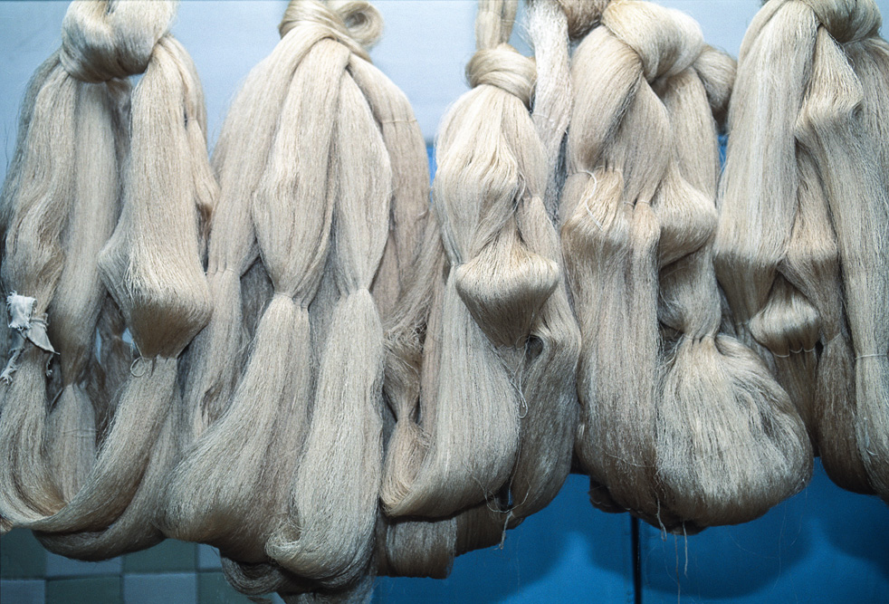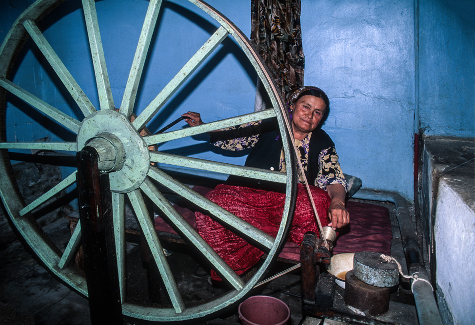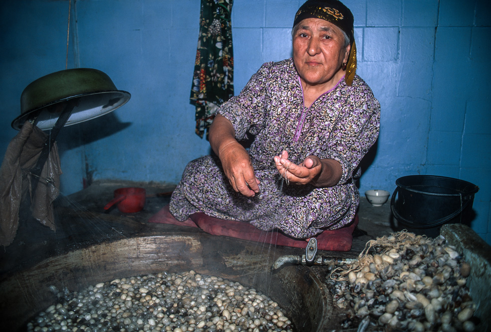 Am kommenden morgen bin ich in der Seidenfabrik „Yodgorlik“ in Margilan angemeldet. Die Fabrik wurde 1972 gegründet und war bis 1993 in Staatsbesitz. Mit dem Zusammenbruch der alten Sowjetunion und des Comecon brachen die angestammten Märkte zusammen. Die Seide aus Margilan wollte auf einmal niemand mehr haben. Seit dem Jahr 2000 ist die Fabrik in privater Hand und hat ihren Betrieb wieder aufgenommen. Das Inventar der Fabrik scheint mir jedoch nicht aus den 70er Jahren sondern aus der Vorkriegszeit zu stammen. Von den 450 Arbeiterinnen, die hier beschäftigt sind und 6000 m Seidenstoff pro Monat weben sollen, ist wenig zu sehen. Ich wandere durch die riesigen Werkhallen und verfolgen die einzelnen Schritte der Seidenproduktion. 60% der Fertigung ist reine Naturseide bei uns auch als Khan-Atlas-Seide bekannt.